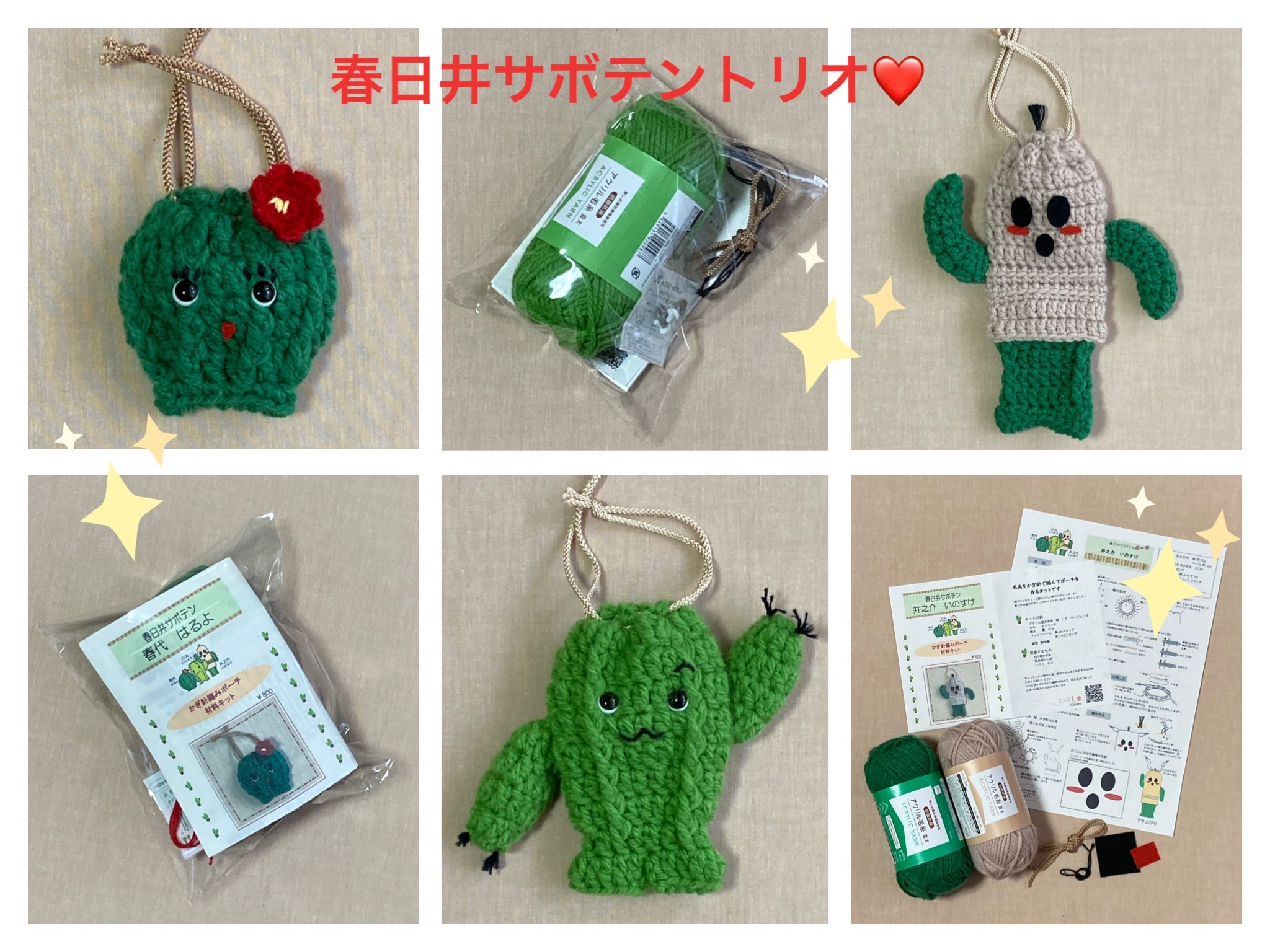 この3人、春代、日丸、井之介をかぎ針で編んでポーチに作る材料キットができました。少し太めの毛糸を使い、目数もそんなに多くないので、手芸好きの小学校高学年くらいのお子さんでも作れると思います。出来上がったら好きなものを入れて身近に使えるので、編物の楽しみを実感して頂けるのではないでしょうか。