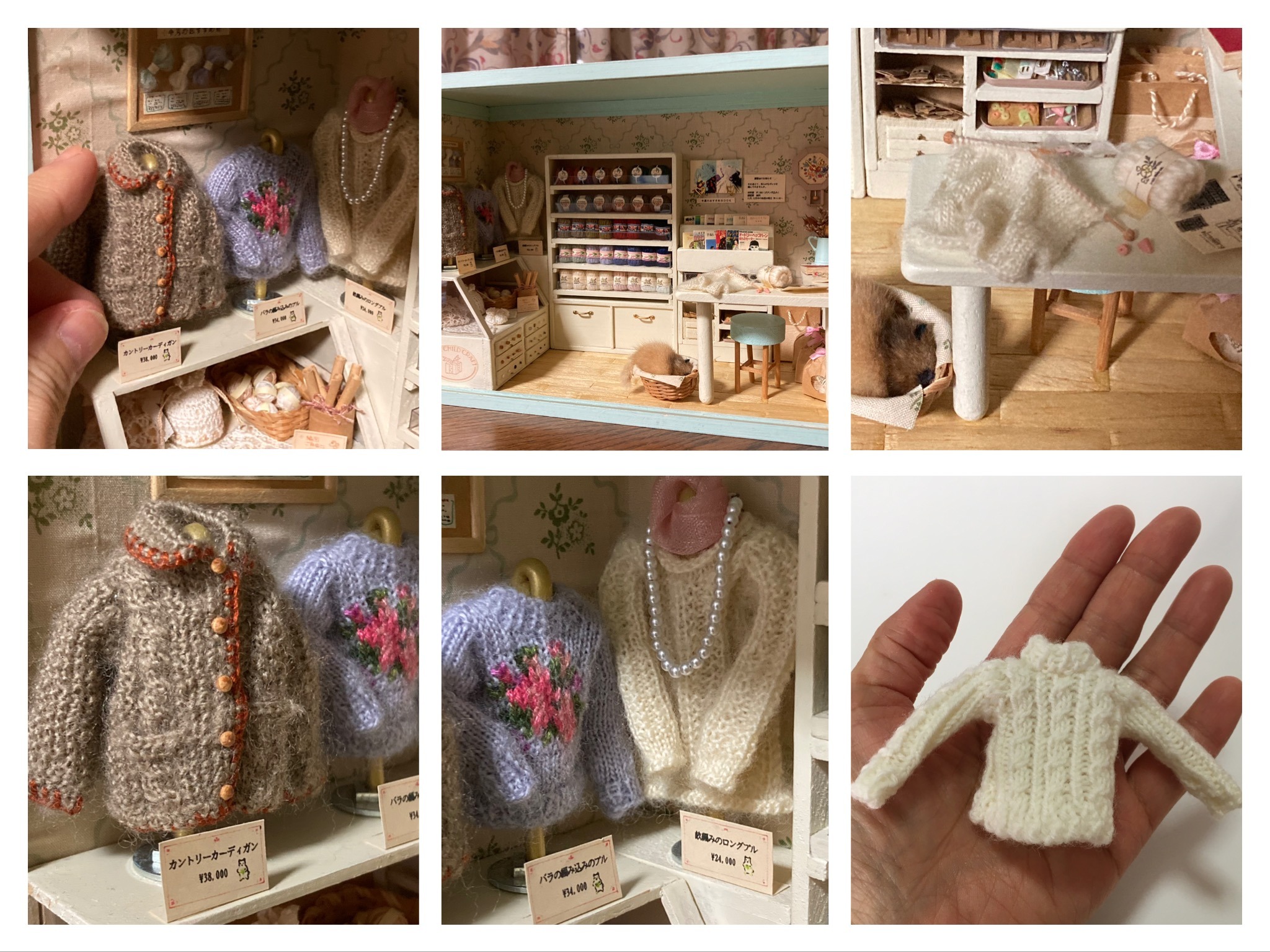 このニットショップのミニチュアは、30年近く前に作ったもの。仕事の傍ら、半年くらいかかったでしょうか。今となっては何せ「ろーがん」、手元の細かいものが見えないので、これほどのものは作れません。残念!でももう少しだけ大きめのミニチュアニットは今でも編んでいます。