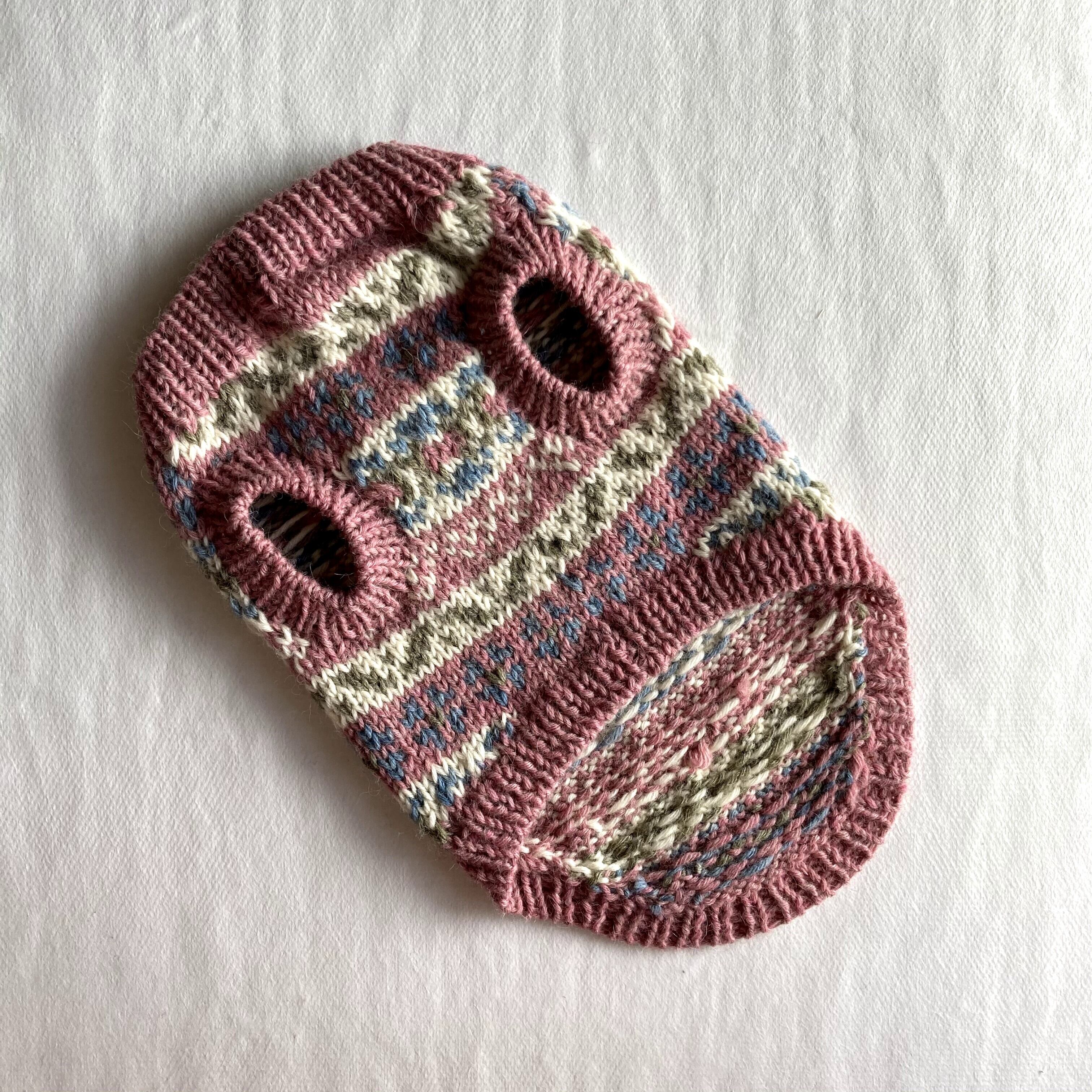 編込みは裏に糸が渡るため地厚になり、保温性は高まるものの、単色の編地に比べると伸縮性が多少小さくなります。そのためレギュラーのMsサイズながら、着せづらくないように胴囲を2㎝大きくしてあります。また胴囲+3㎝程度はきつくなることなく十分対応します。