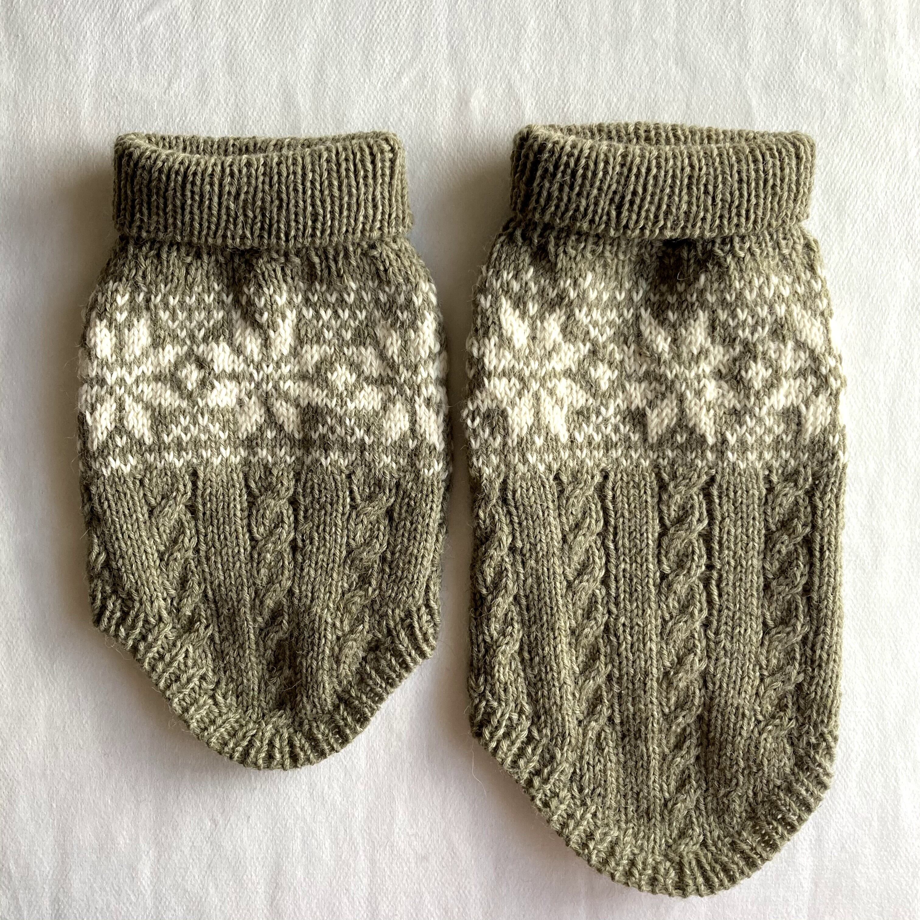 メランジのニュアンスのあるオリーブでケーブル模様を、アイボリーで雪柄を編みこんだ、正統派ニット。シンプルなデザインが長く愛されてきた伝統柄を引き立てます。