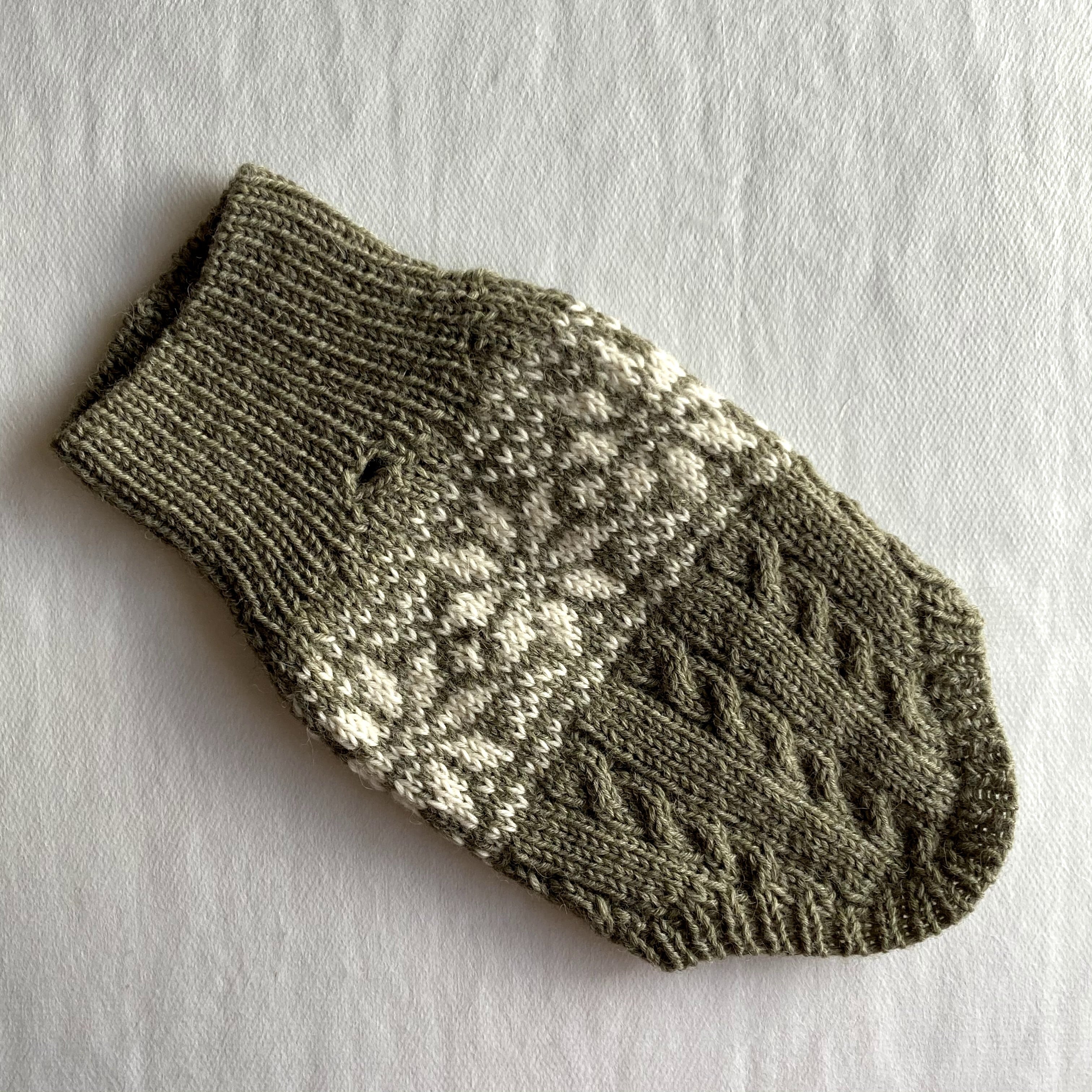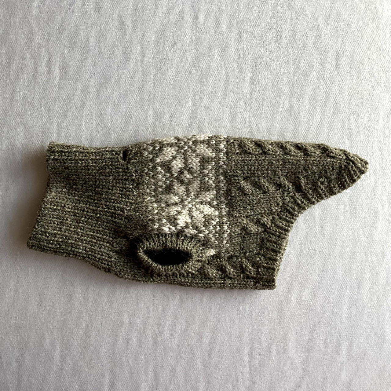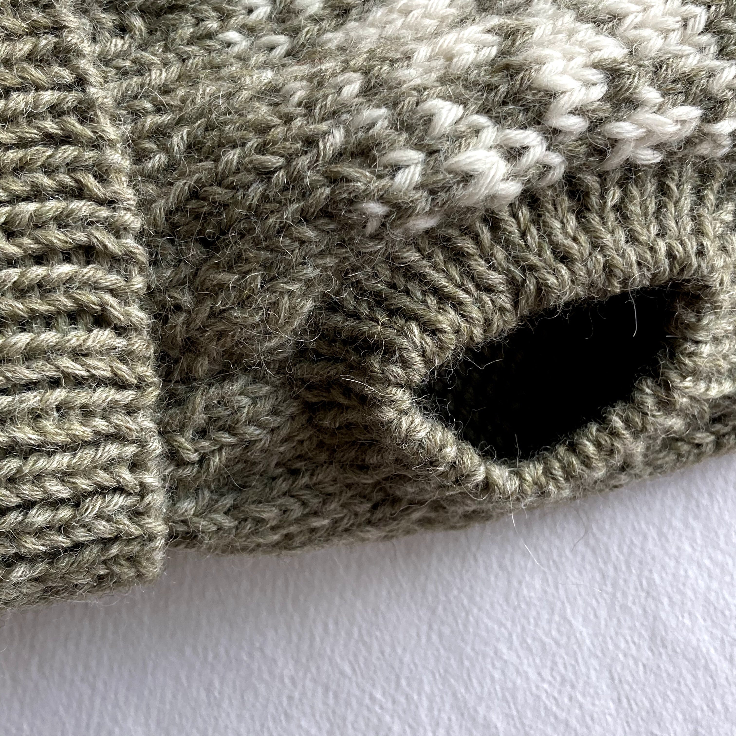 反転色のアイボリーをベースにオリーブで編みこんだタイプ、丈のみ長めのMサイズもあります。