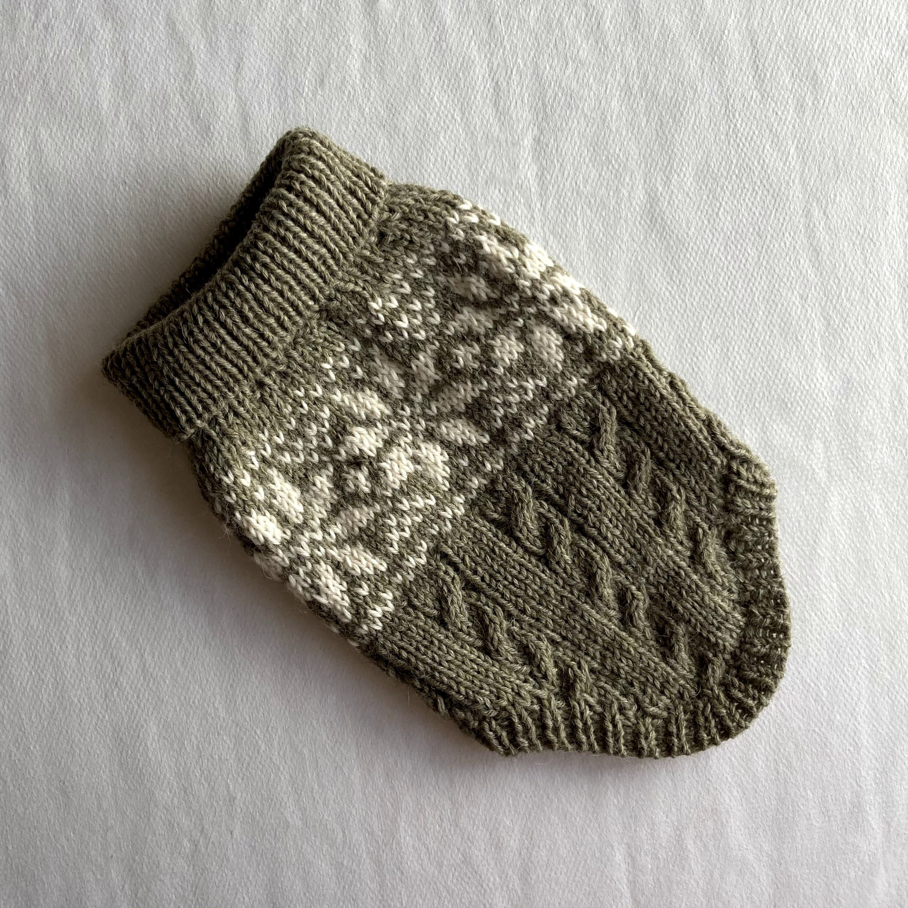 メランジのニュアンスのあるオリーブでケーブル模様を、アイボリーで雪柄を編みこんだ、正統派ニット。シンプルなデザインが長く愛されてきた伝統柄を引き立てます。