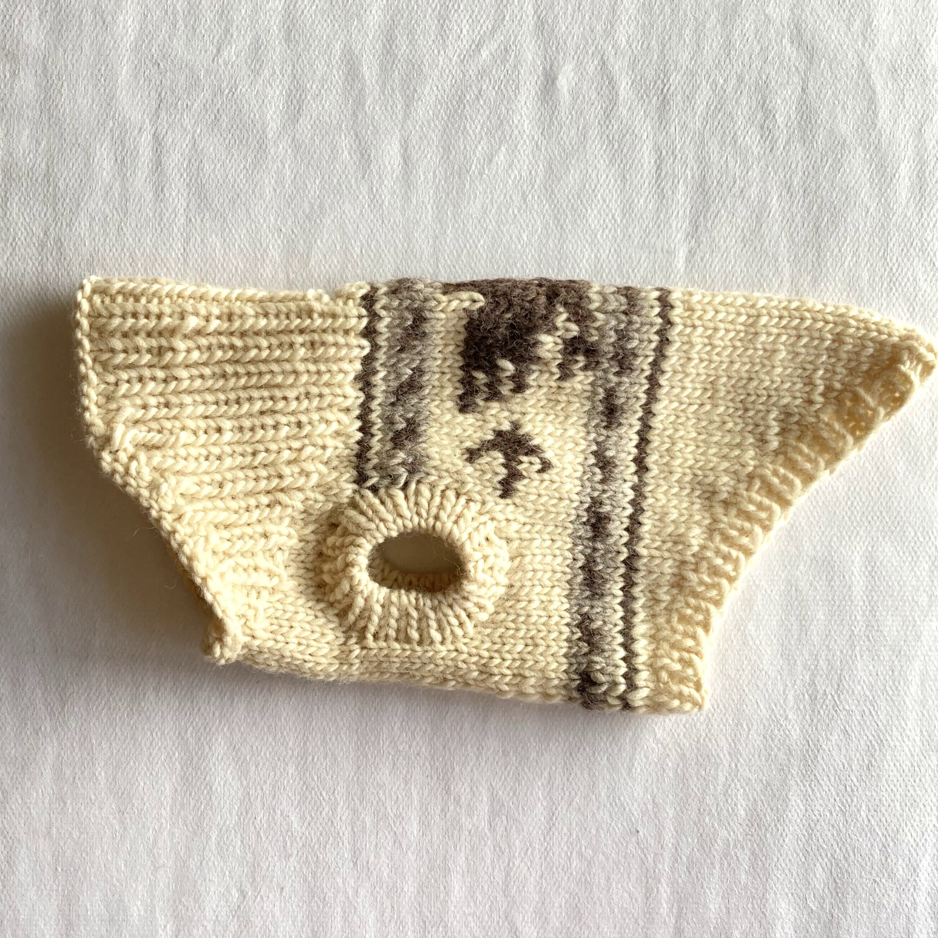 ロービングヤーン(撚りの甘い太い糸)で編んだカウチンニット。本物のカウチンニットのように自然な色合いの糸を使用し、衿はカウチンらしさともいえるショールカラーにしています。