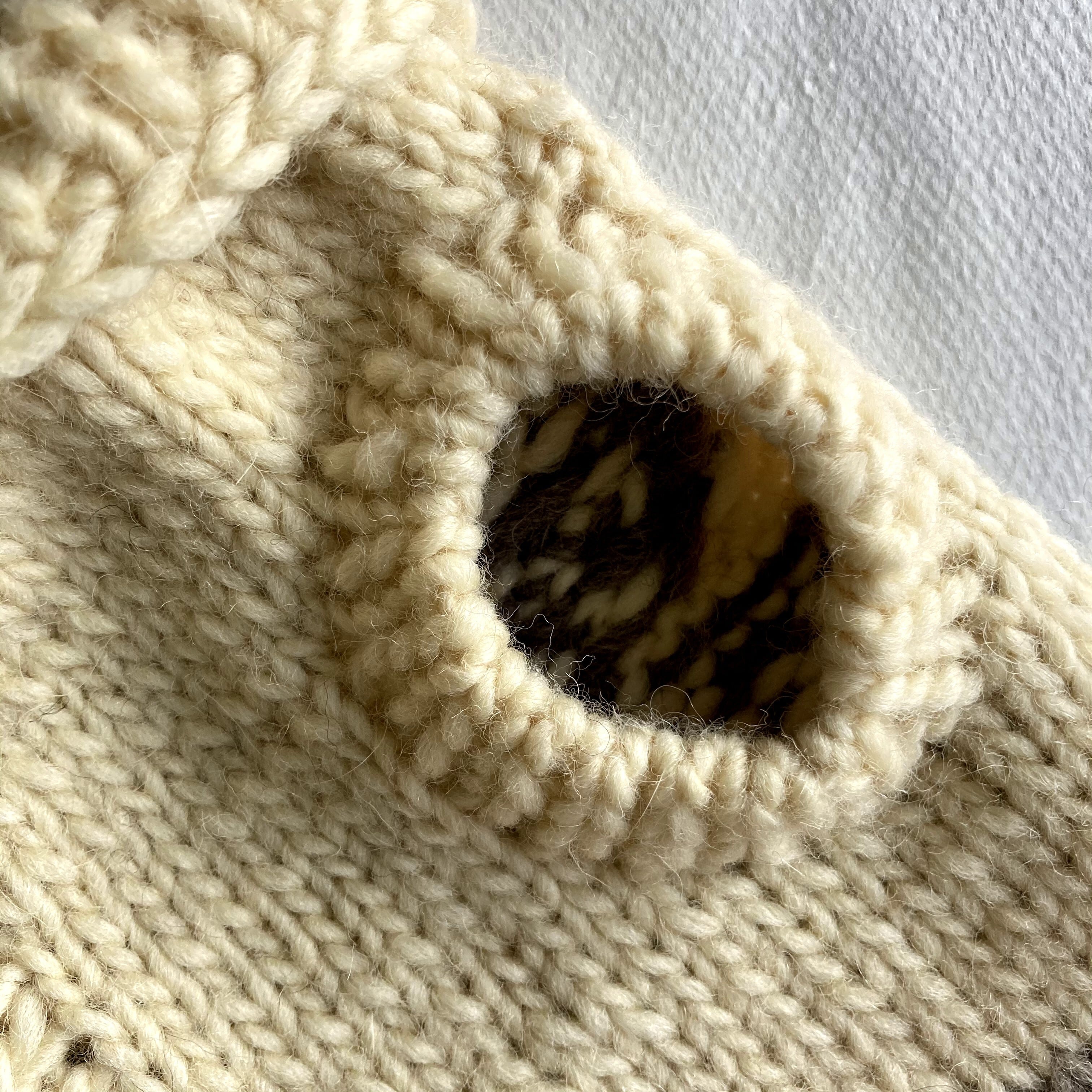 ロービングヤーン(撚りの甘い太い糸)で編んだカウチンニット。本物のカウチンニットのように自然な色合いの糸を使用し、衿はカウチンらしさともいえるショールカラーにしています。
