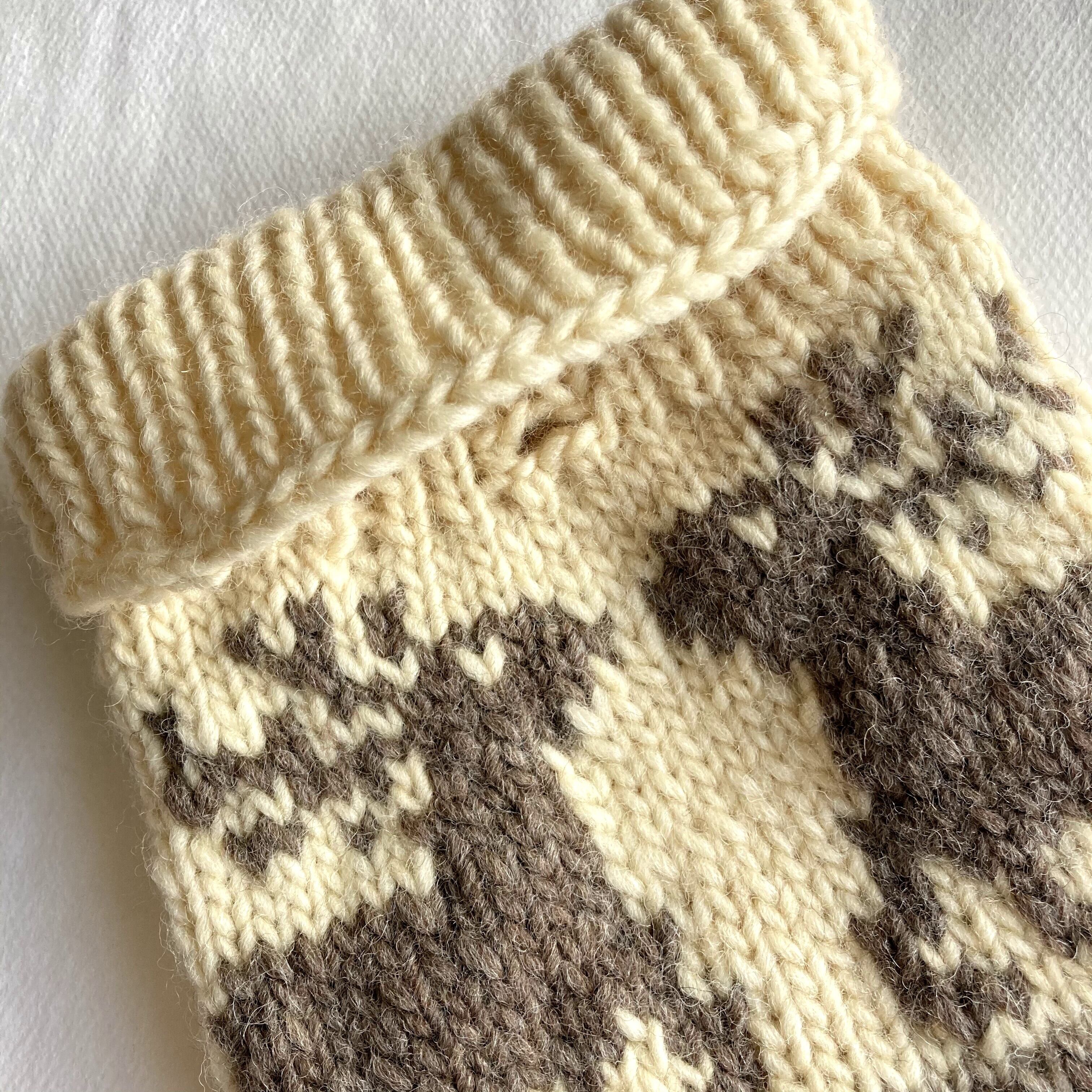 ロービングヤーン(撚りの甘い太い糸)で編んだカウチンニット。本物のカウチンニットのように自然な色合いの糸を使用し、衿はカウチンらしさともいえるショールカラーにしています。