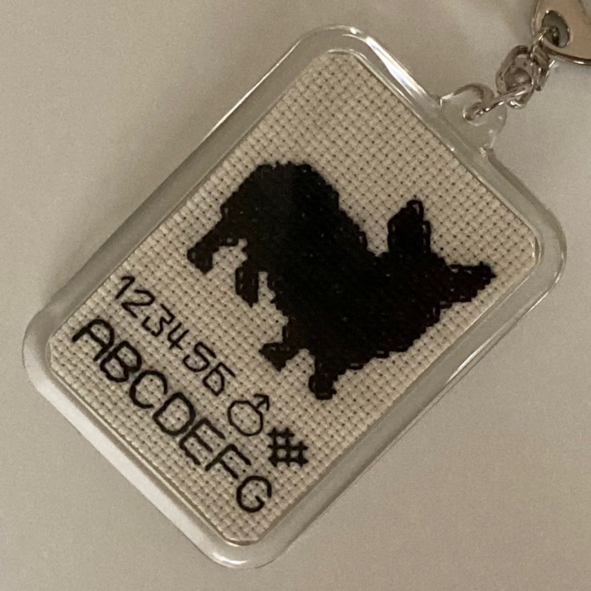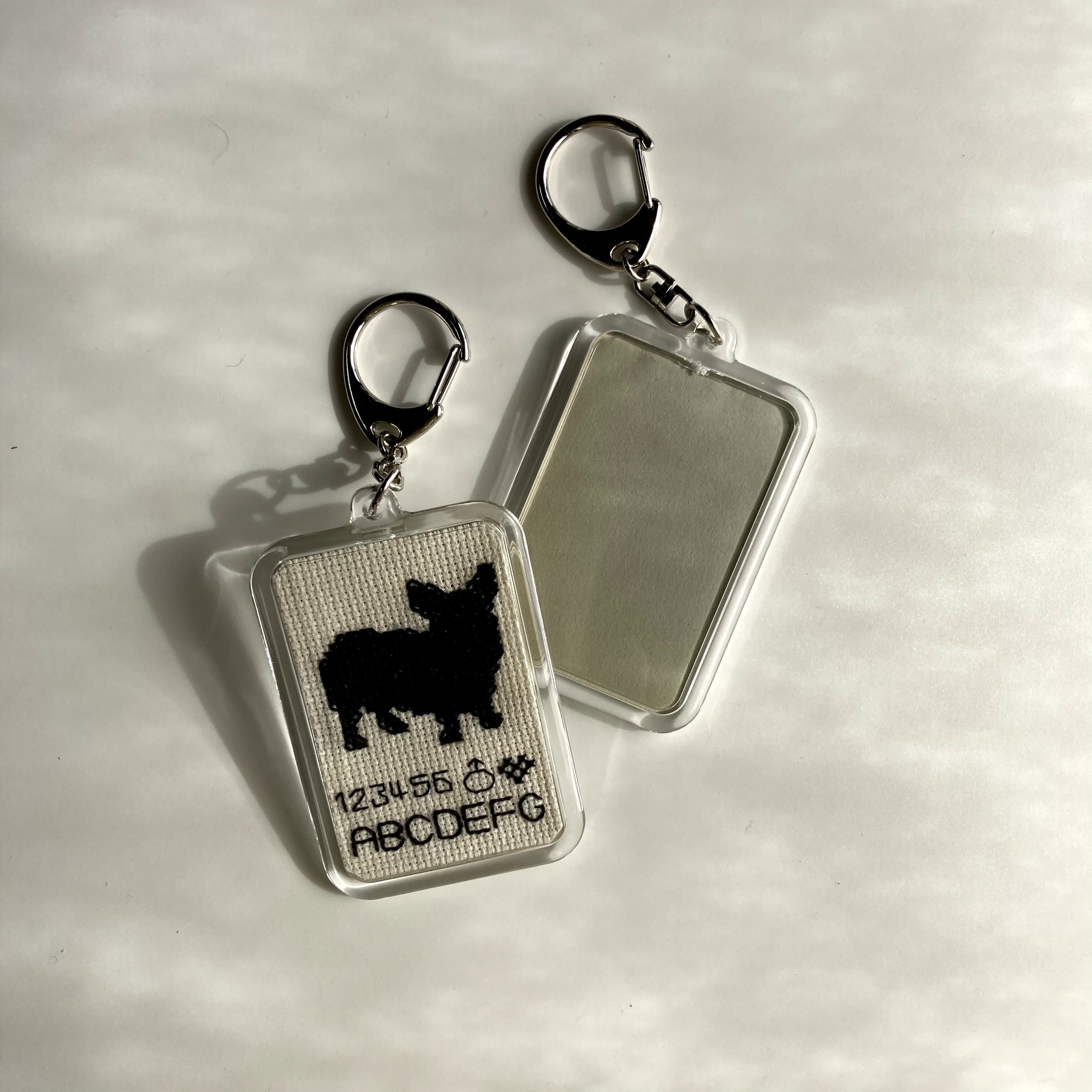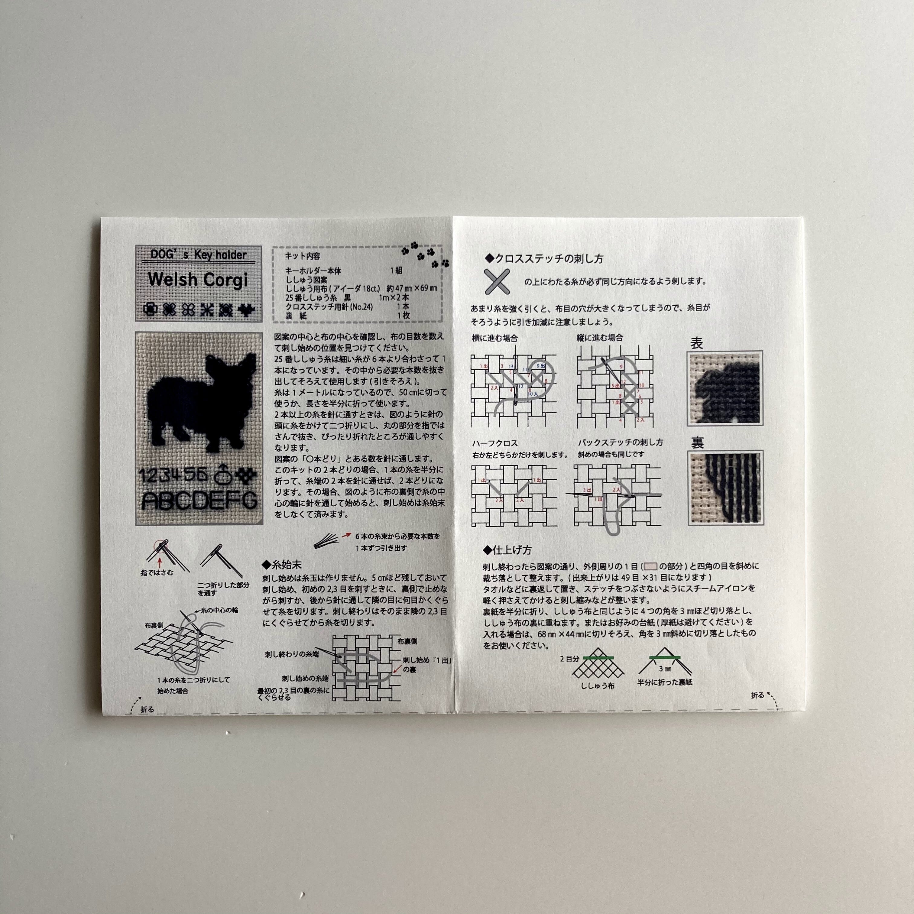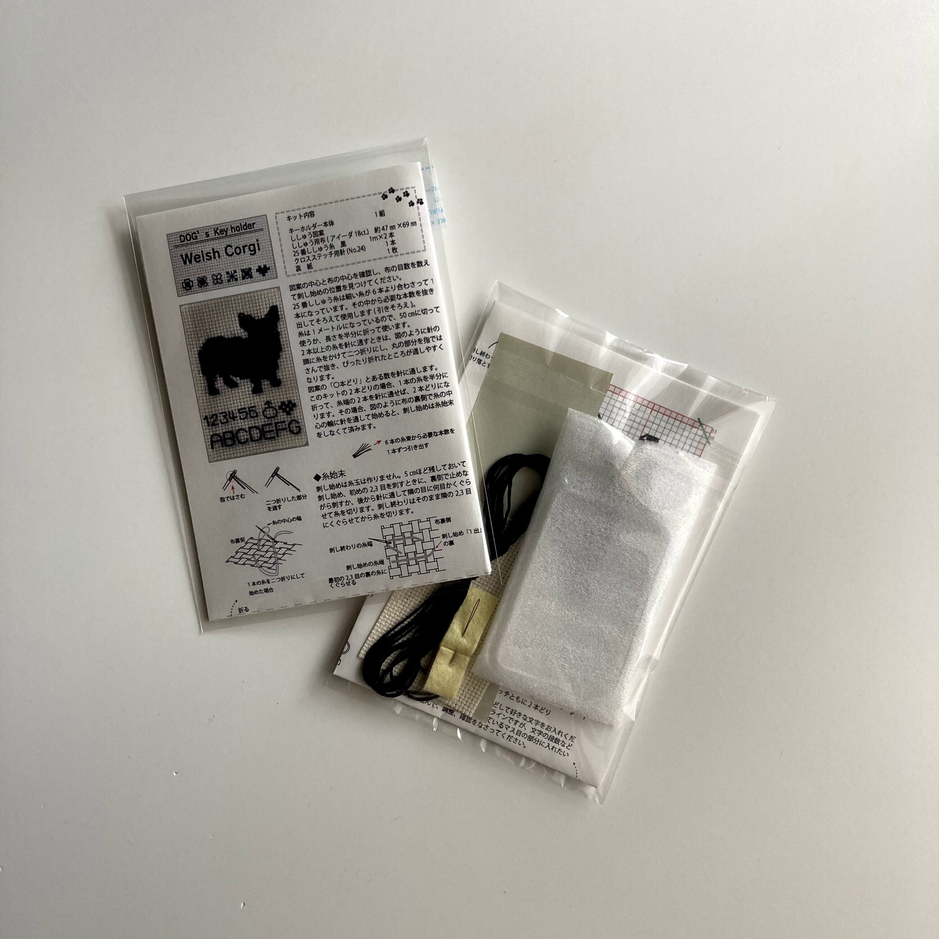 クロスステッチでウェルシュコーギーのシルエットを刺し、キーホルダーに仕立てるキットです。