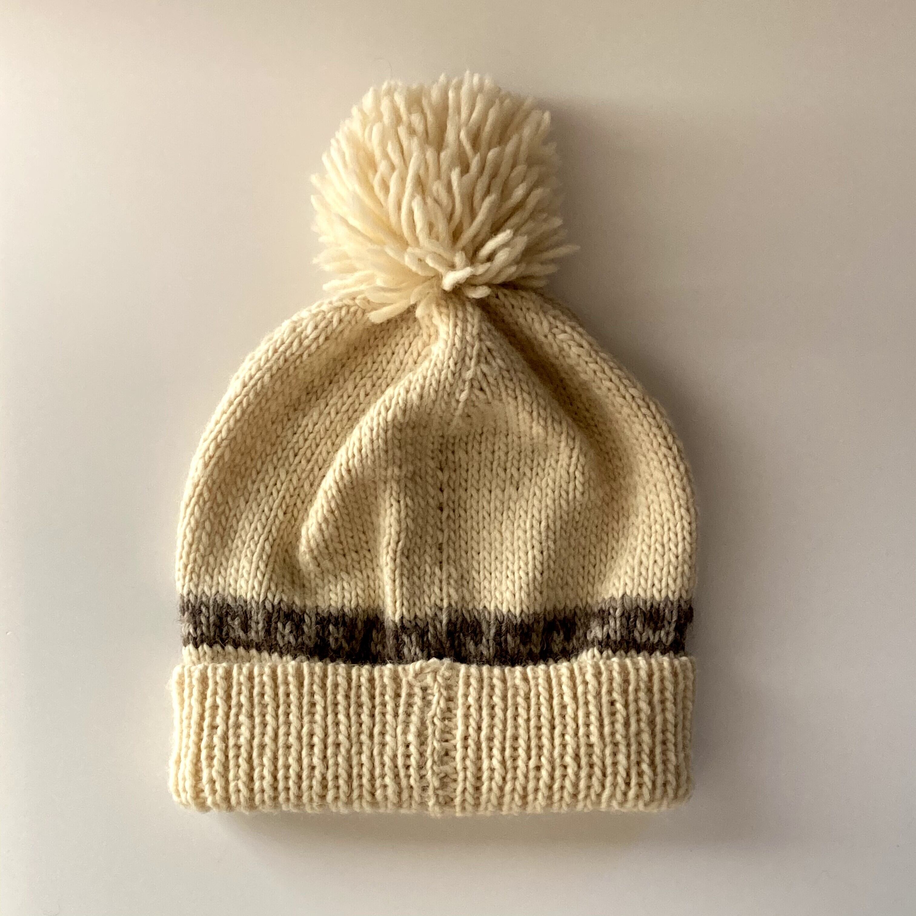 ロービングヤーン(撚りの甘い太い糸)で編んだカウチンのニット帽。本物のカウチンニットのように自然な色合いの糸を使用し、ざっくりした太糸で伝統柄のトナカイを編込んでいます。