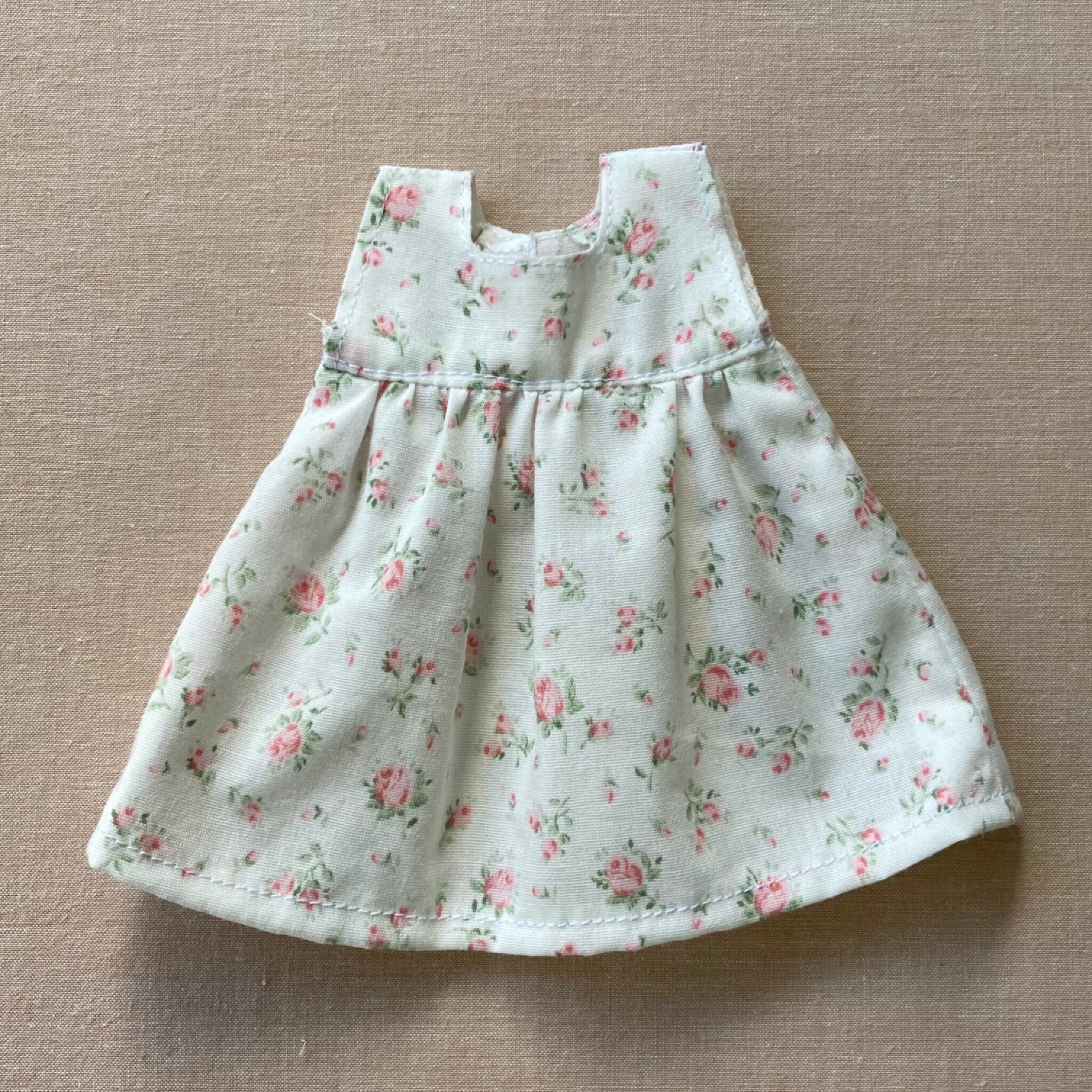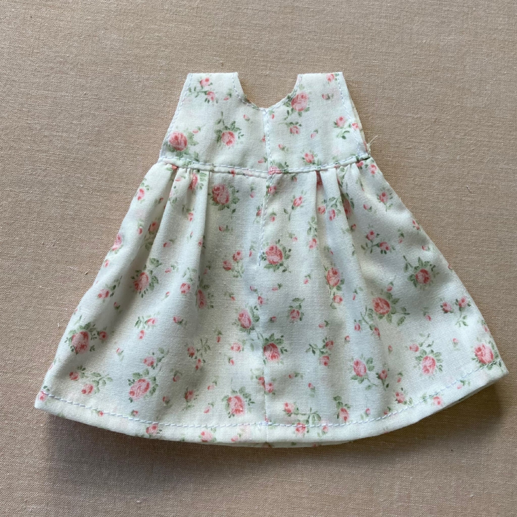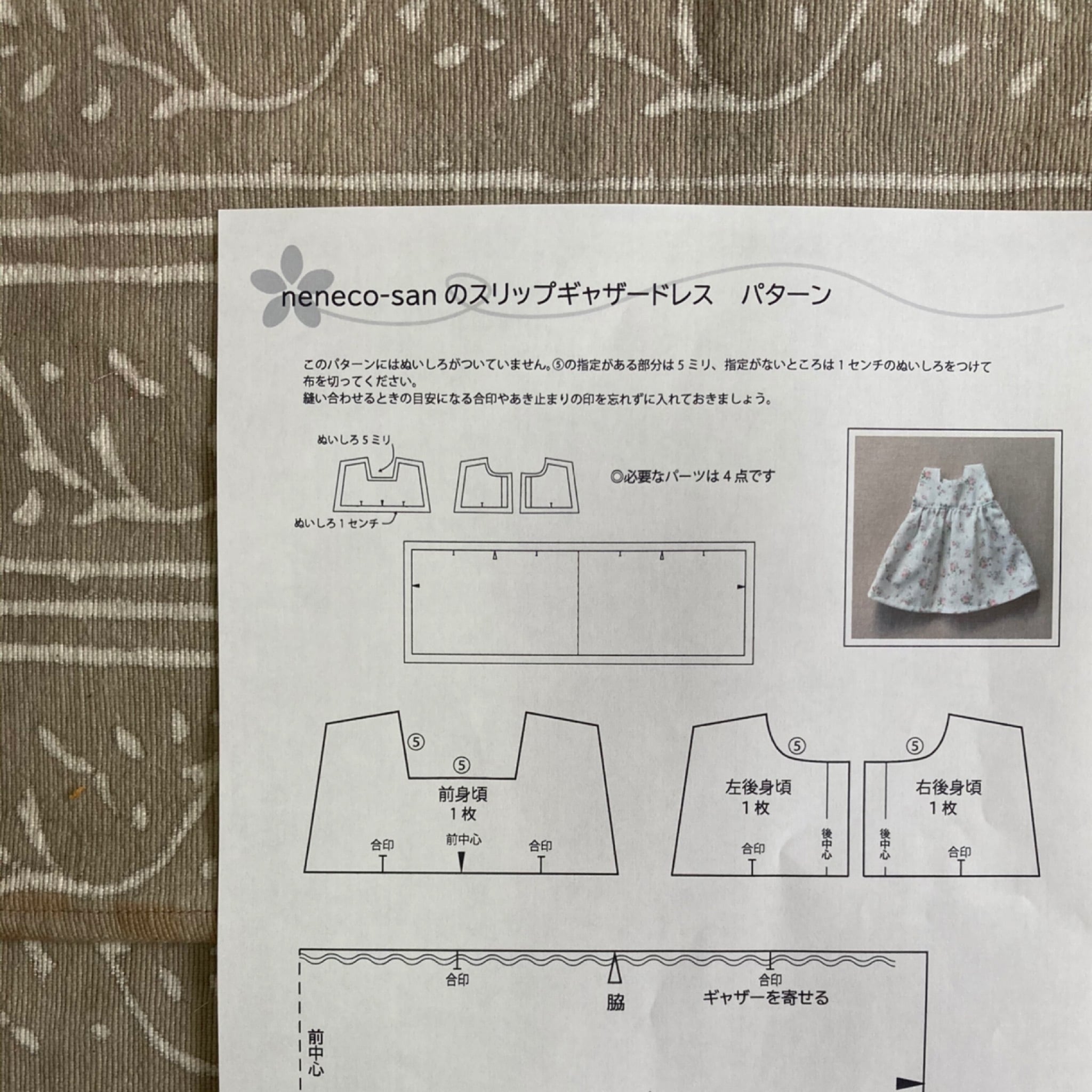 基本的な形のスリップギャザードレス。袖付けがないので簡単です。細かい柄も可愛いのですが、案外大き目の柄も映えます。その場合は、柄の入る位置をパターンを置いて確かめてから裁断してくださいね。