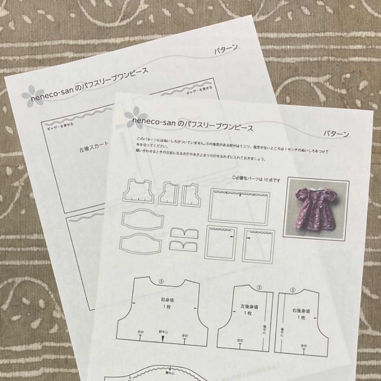 実物大のパターンと作り方の説明書です。材料、ねねこさんは入っていません。お好きな生地をご用意ください。