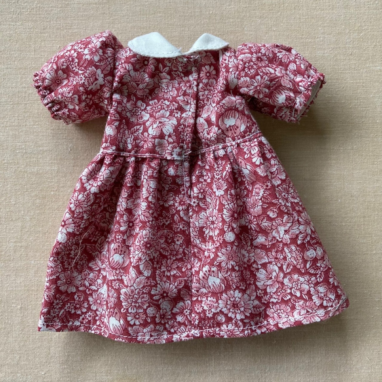 少し昔のよそ行きのような、レトロなワンピース。ふわっとしたパフスリーブの袖口は、ゴムを直接縫いつけているので、案外簡単です。白い襟をつけていますが、ちょっと豪華なレースなどを使っても素敵ですね。