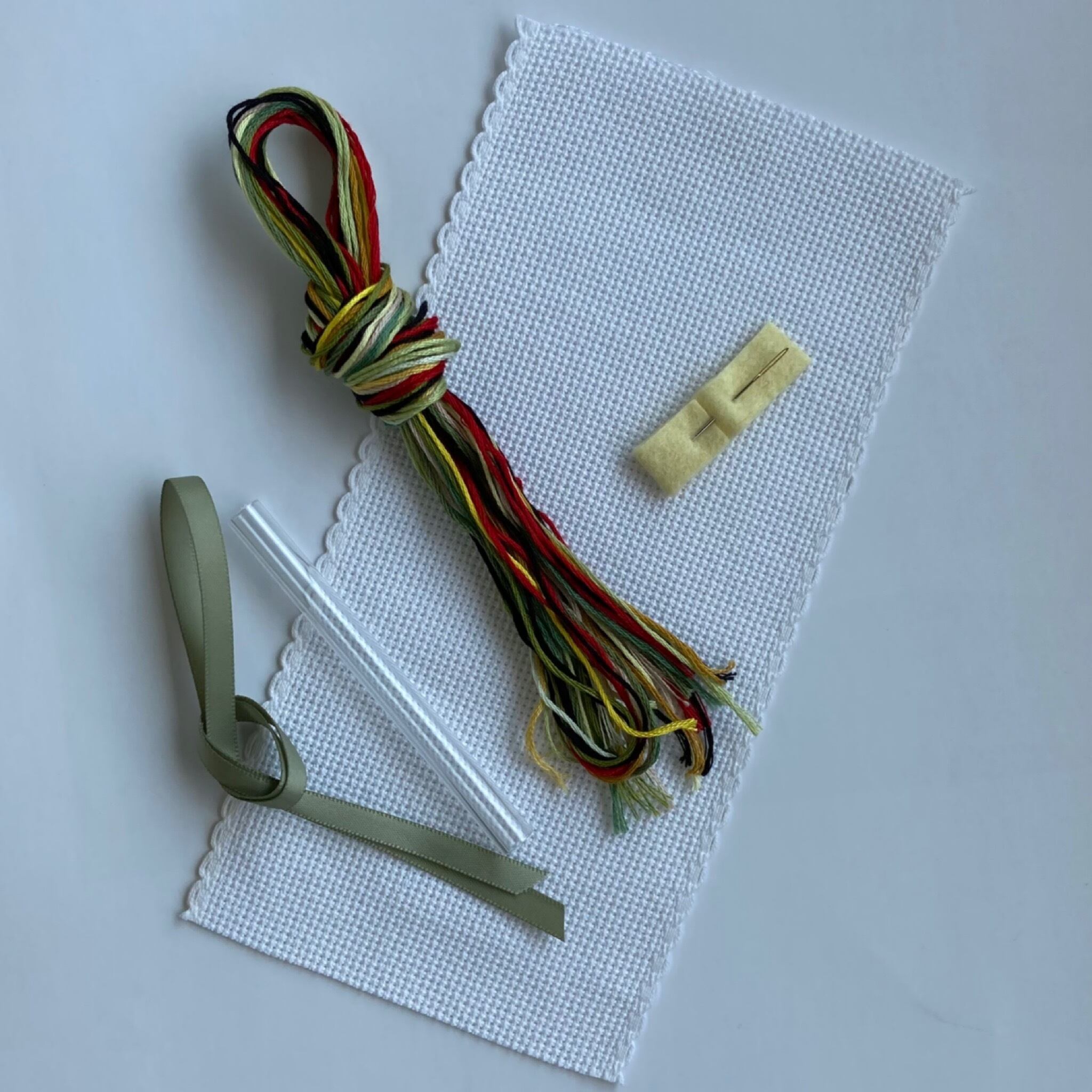 壁飾り(ベルプル)に仕立てます。幅10センチの小さな作品ですが、1センチ当たり約6目のクロスステッチが入る細かな布目なので、刺しごたえは十分です。また細かい布目ならではの表現ができるので、高い完成度のでき上がりになります。