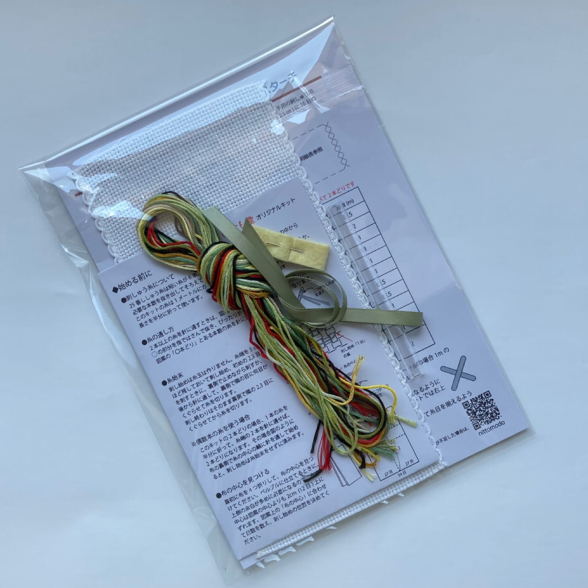 キットには図案と糸、布や針、仕立て上がりに必要な材料がすべて入っているので、すぐに始められます。ただひとつだけ、仕立てるのに必要な白の手縫い糸のみ、お手持ちのものをご利用ください。