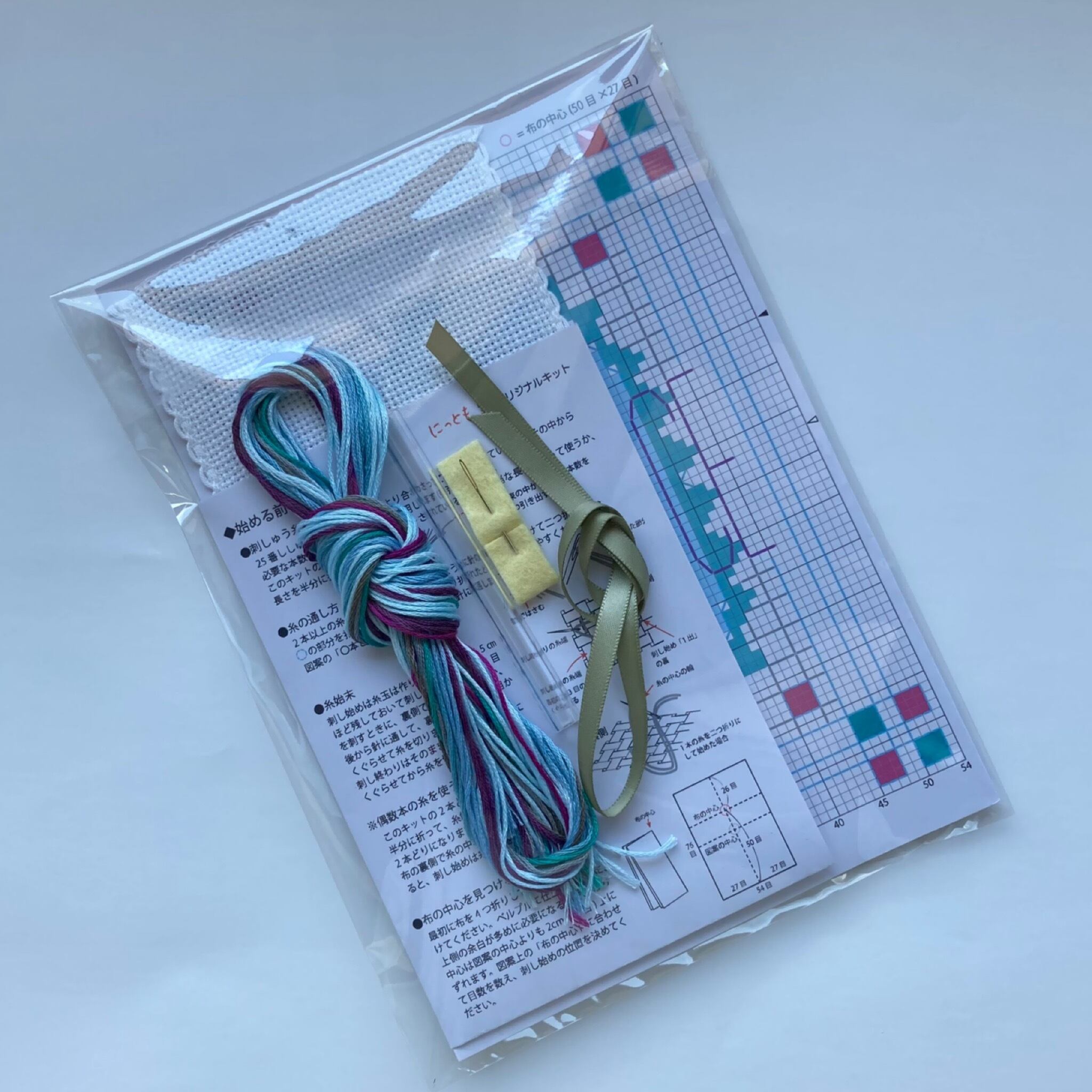 キットには図案と糸、布や針、仕立て上がりに必要な材料がすべて入っているので、すぐに始められます。ただひとつだけ、仕立てるのに必要な白の手縫い糸のみ、お手持ちのものをご利用ください。