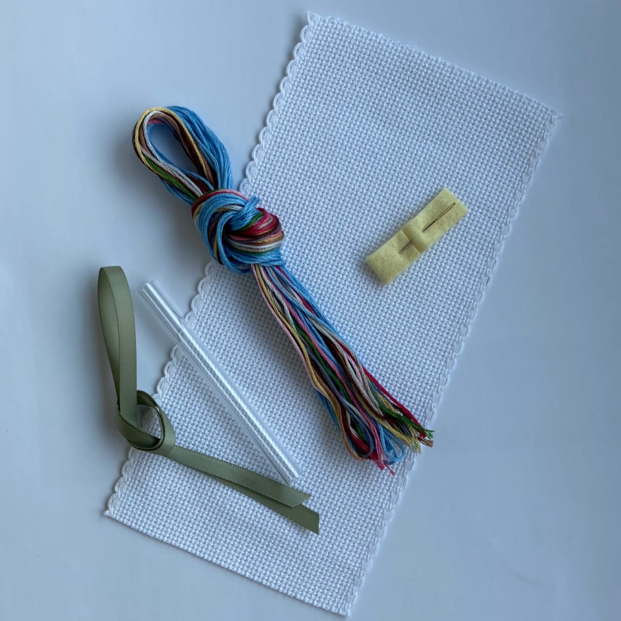 壁飾り(ベルプル)に仕立てます。幅10センチの小さな作品ですが、1センチ当たり約6目のクロスステッチが入る細かな布目なので、刺しごたえは十分です。また細かい布目ならではの表現ができるので、高い完成度のでき上がりになります。