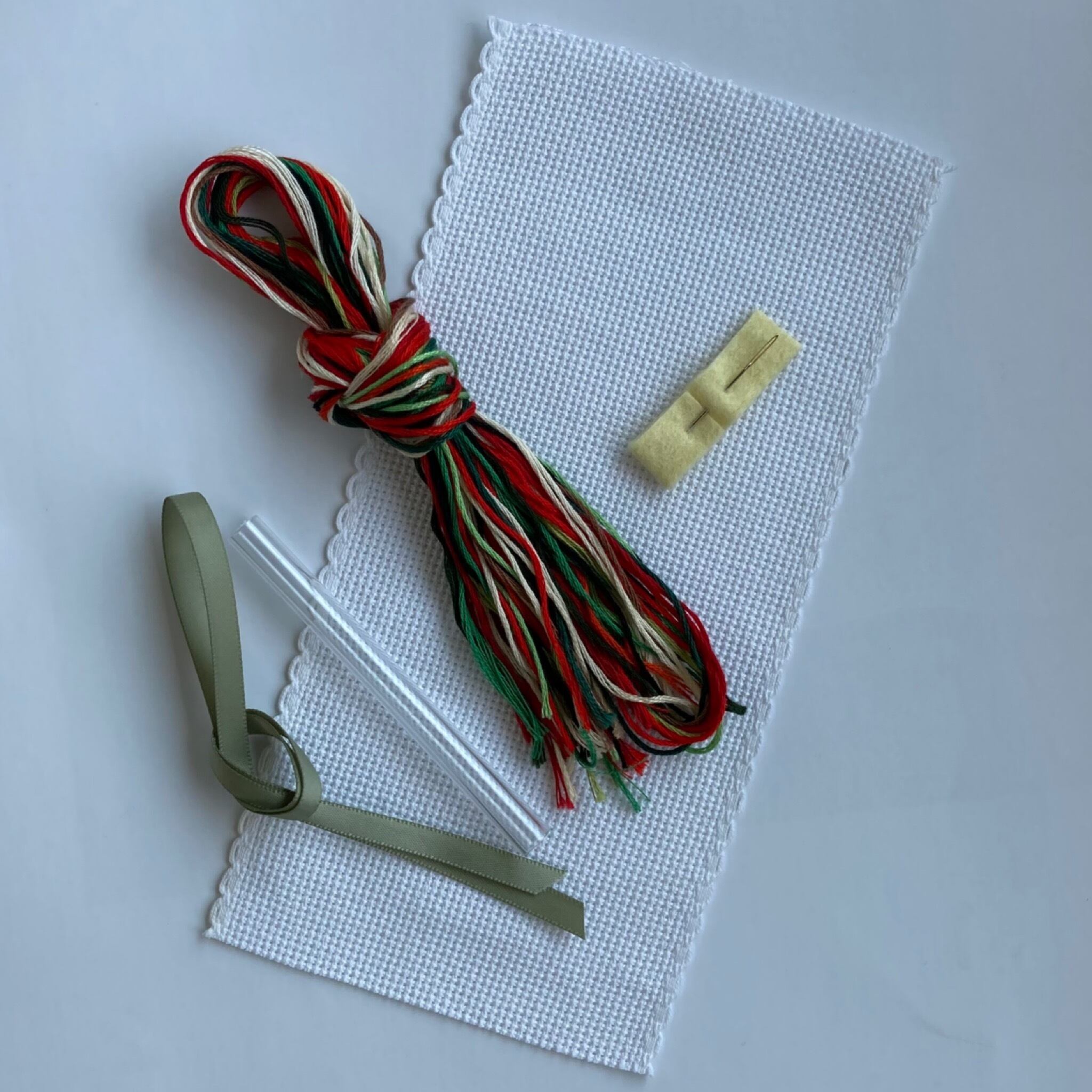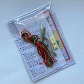 キットには図案と糸、布や針、仕立て上がりに必要な材料がすべて入っているので、すぐに始められます。ただひとつだけ、仕立てるのに必要な白の手縫い糸のみ、お手持ちのものをご利用ください。