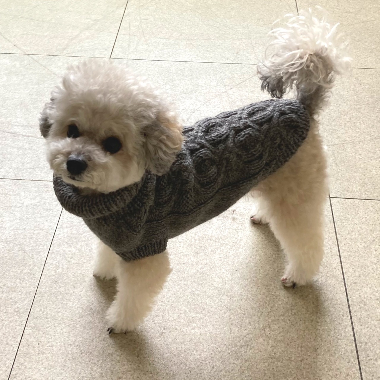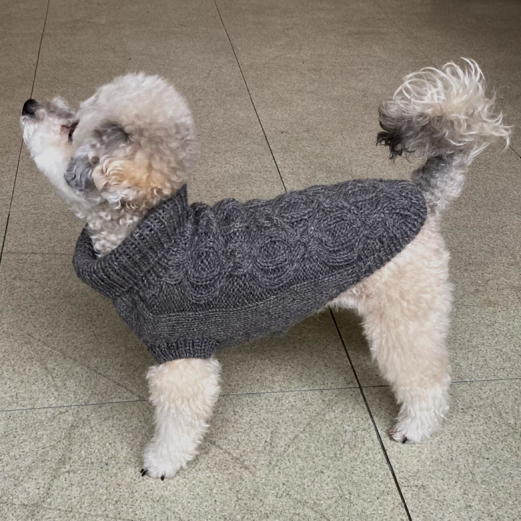 メランジ調のチャコールグレーの毛糸がやさしい印象のケーブル模様を作る、ちょっとシックなニットです。濃い色でも深くはっきりした模様を浮き立たせています。7号の棒針で編んだ編地は薄すぎず地厚すぎずで程よい柔らかさです。