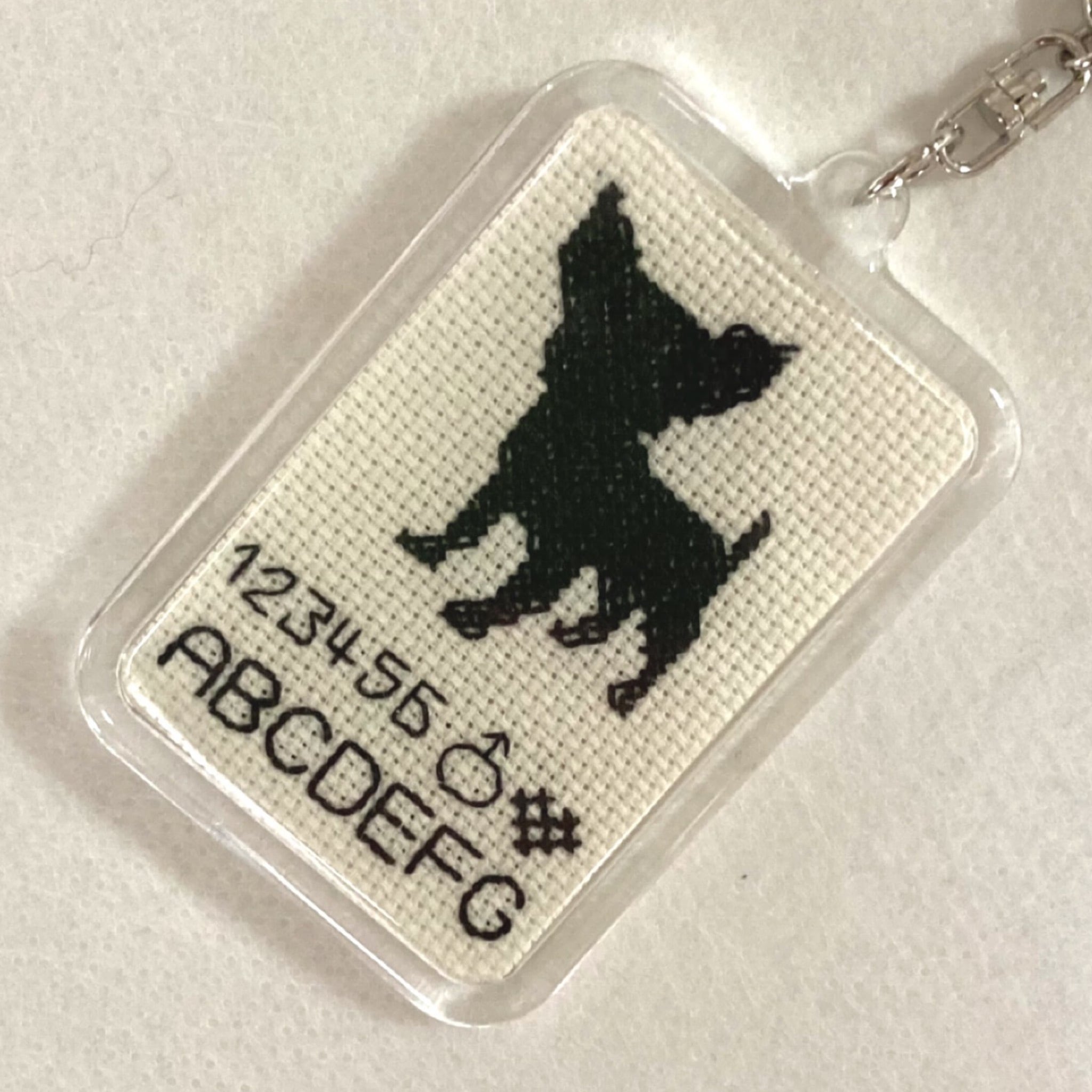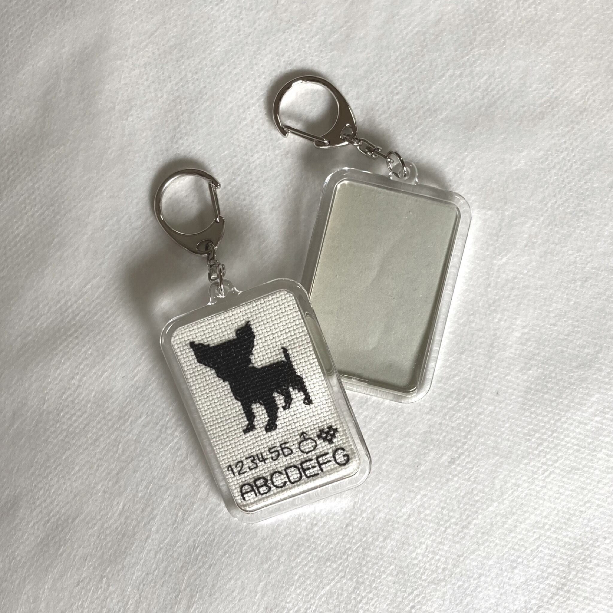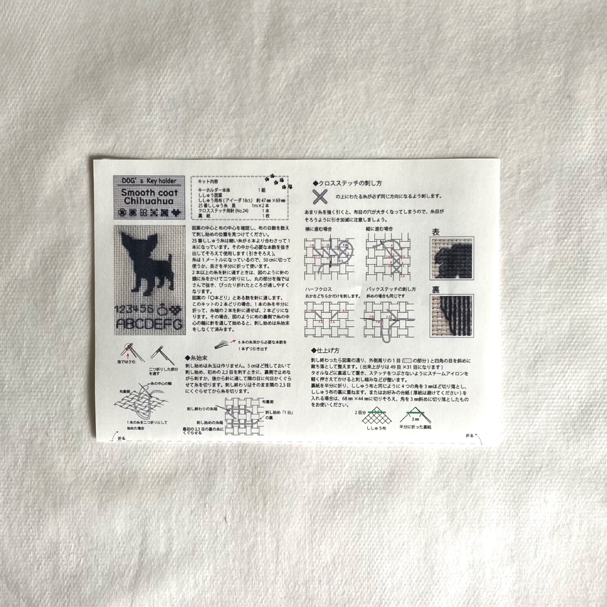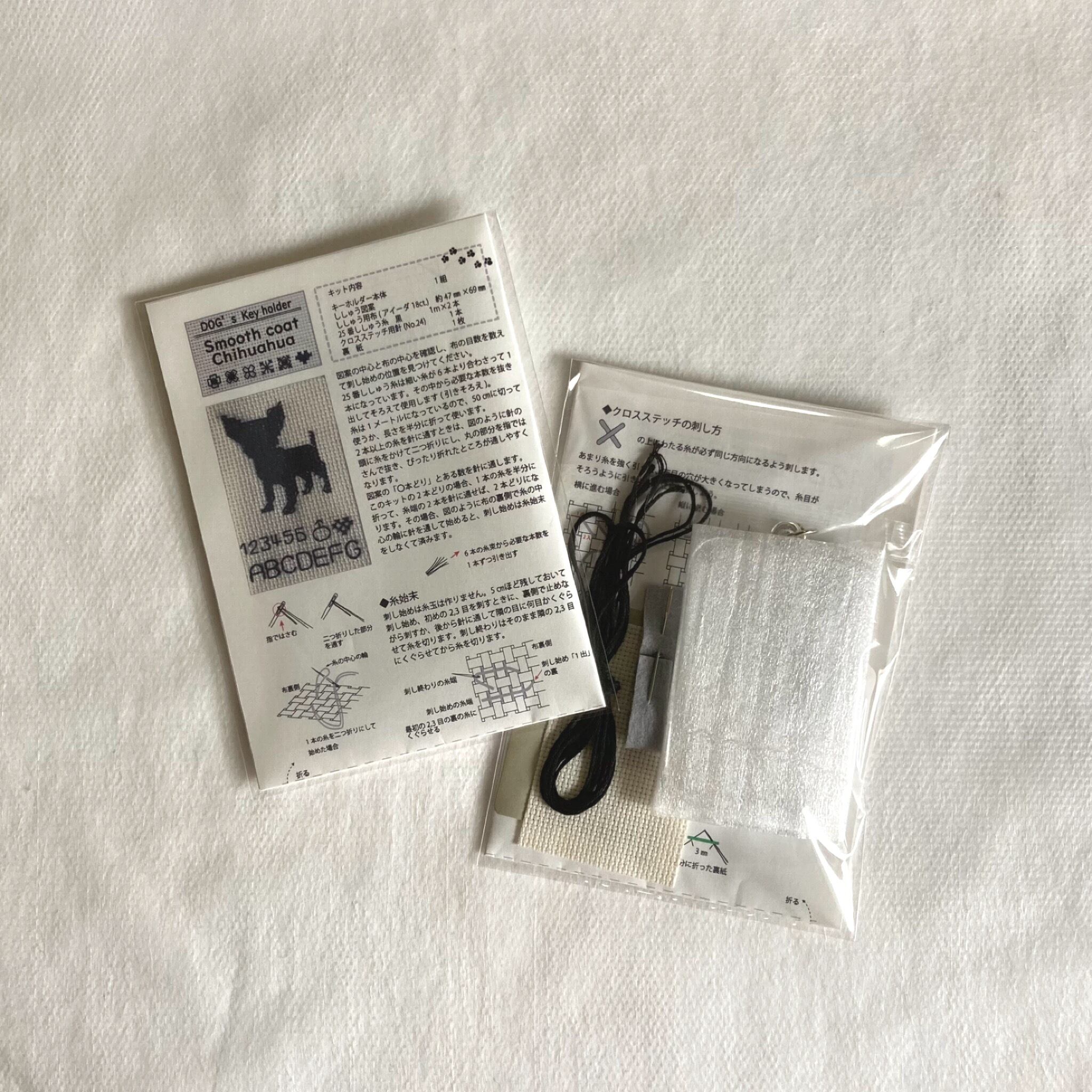 クロスステッチでスムースコートチワワのシルエットを刺し、キーホルダーに仕立てるキットです。