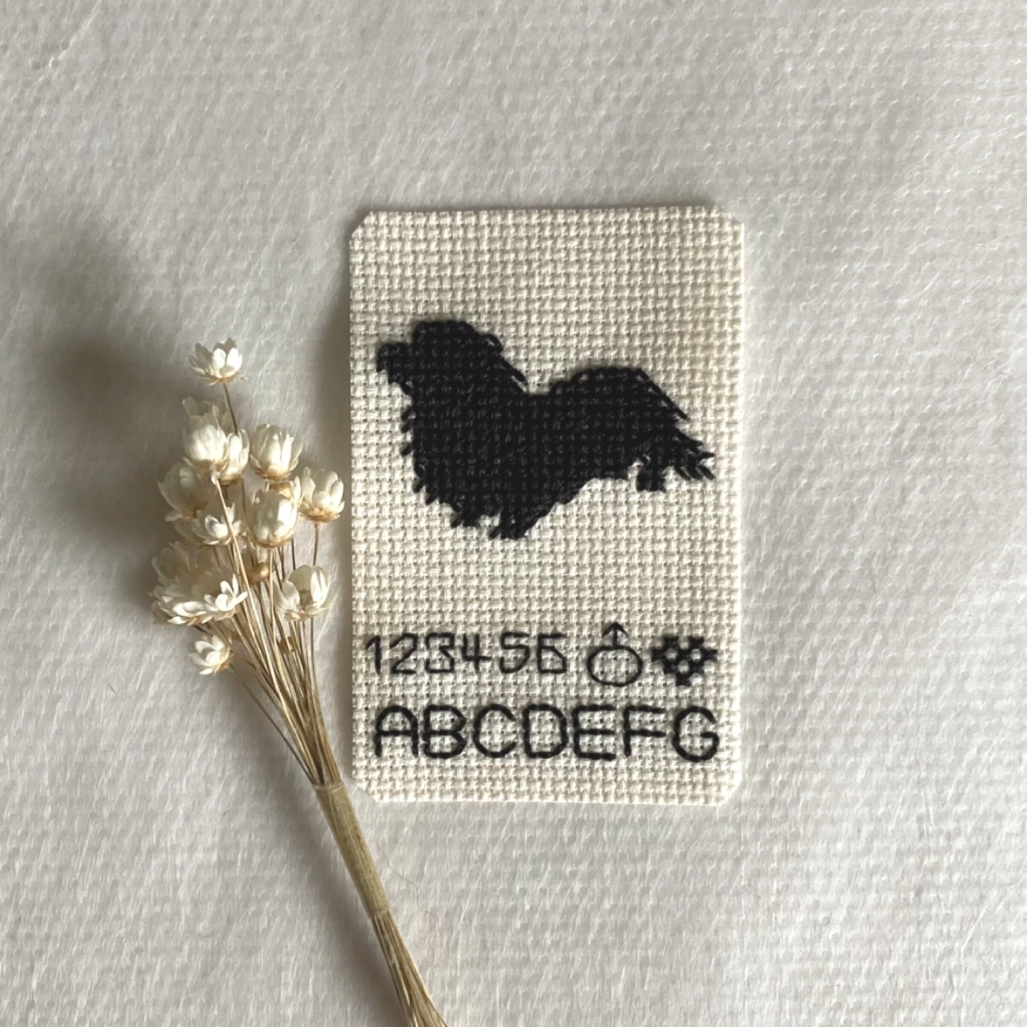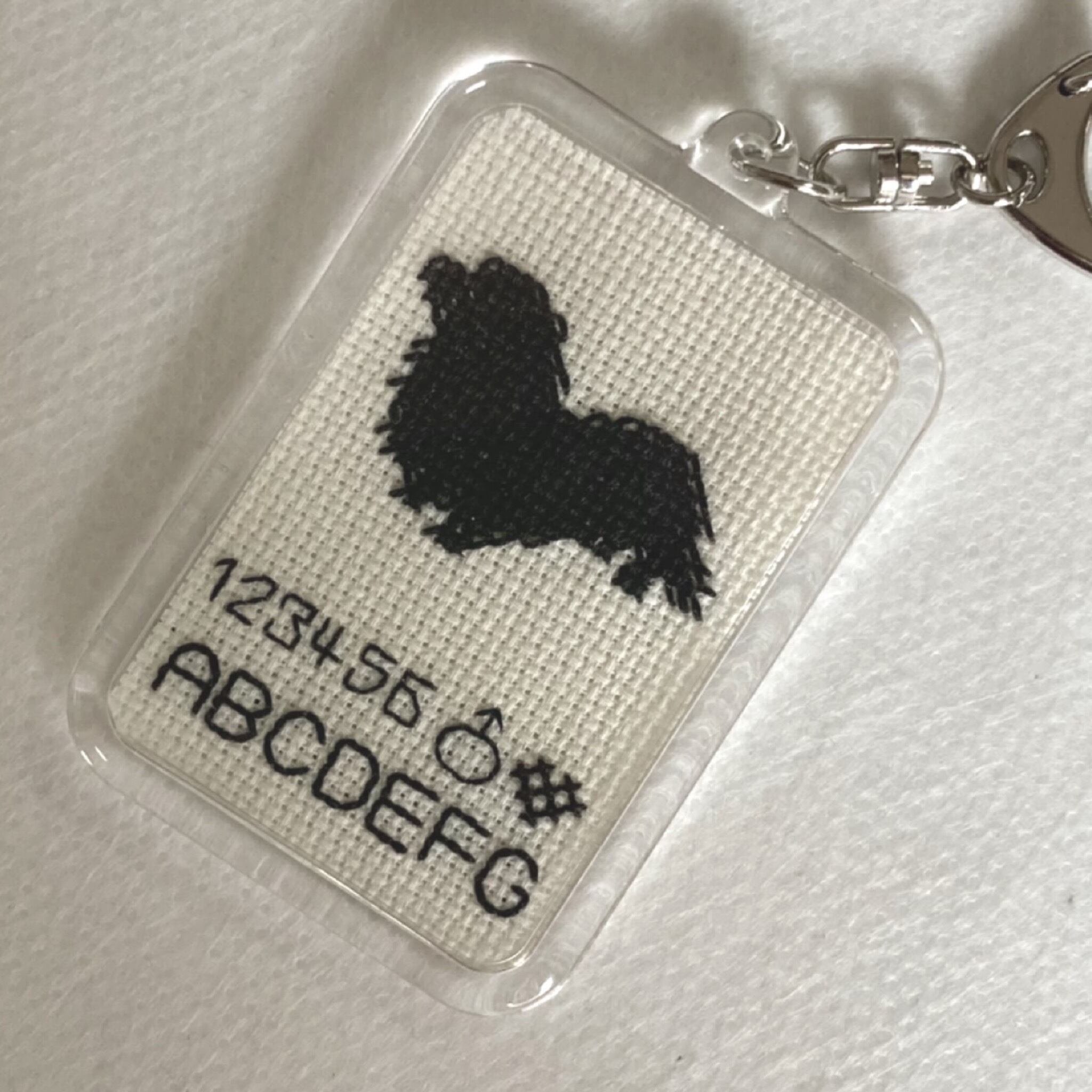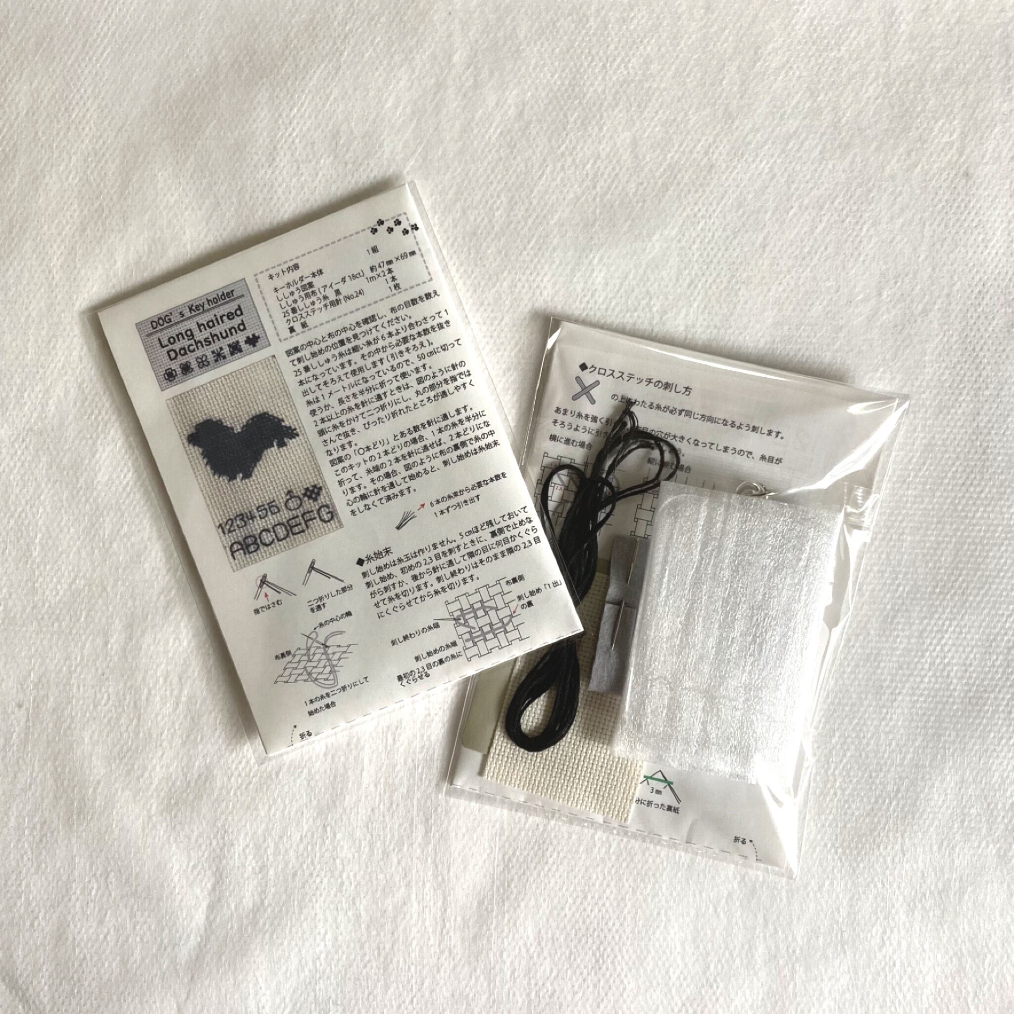 クロスステッチでロングヘアードダックスフントのシルエットを刺し、キーホルダーに仕立てるキットです。