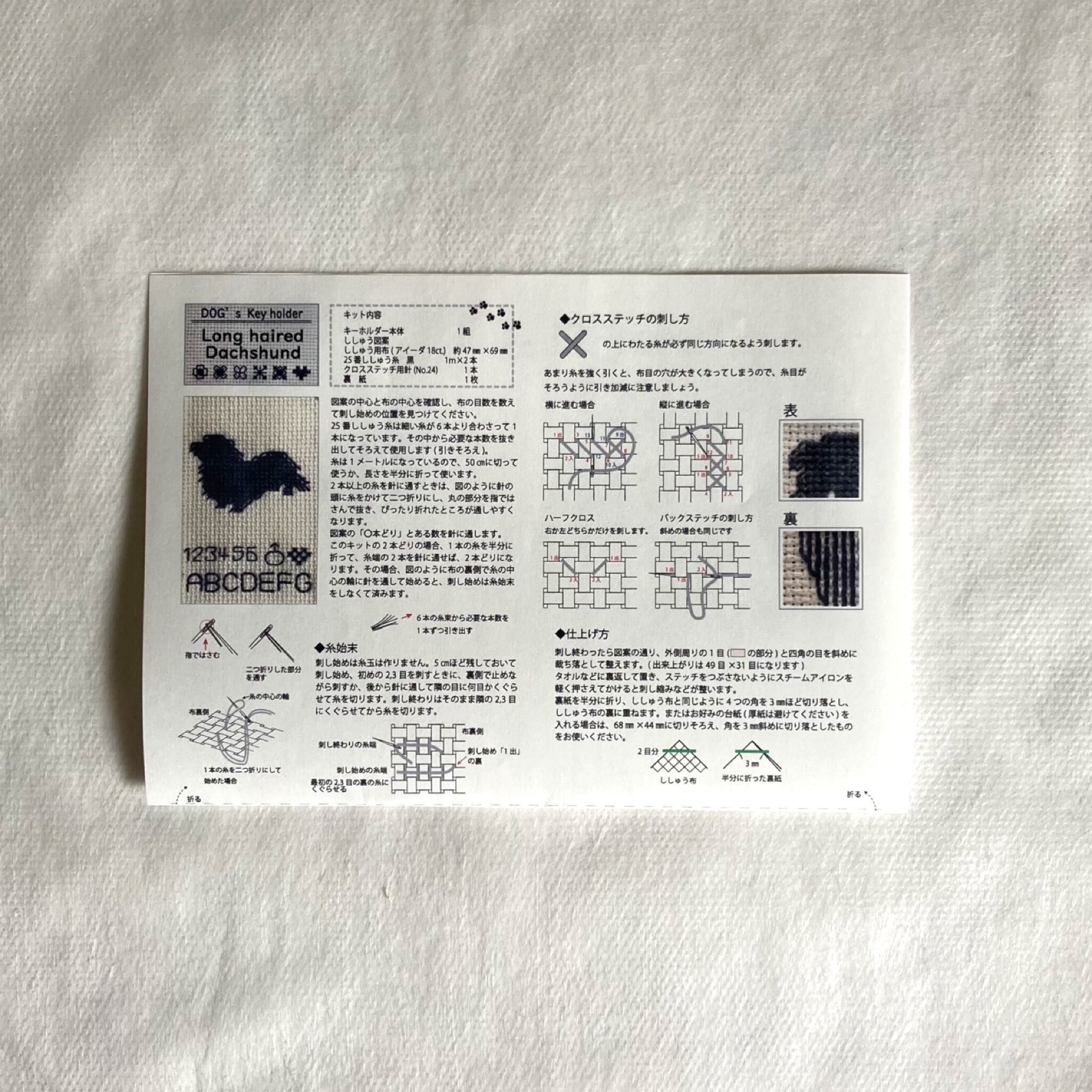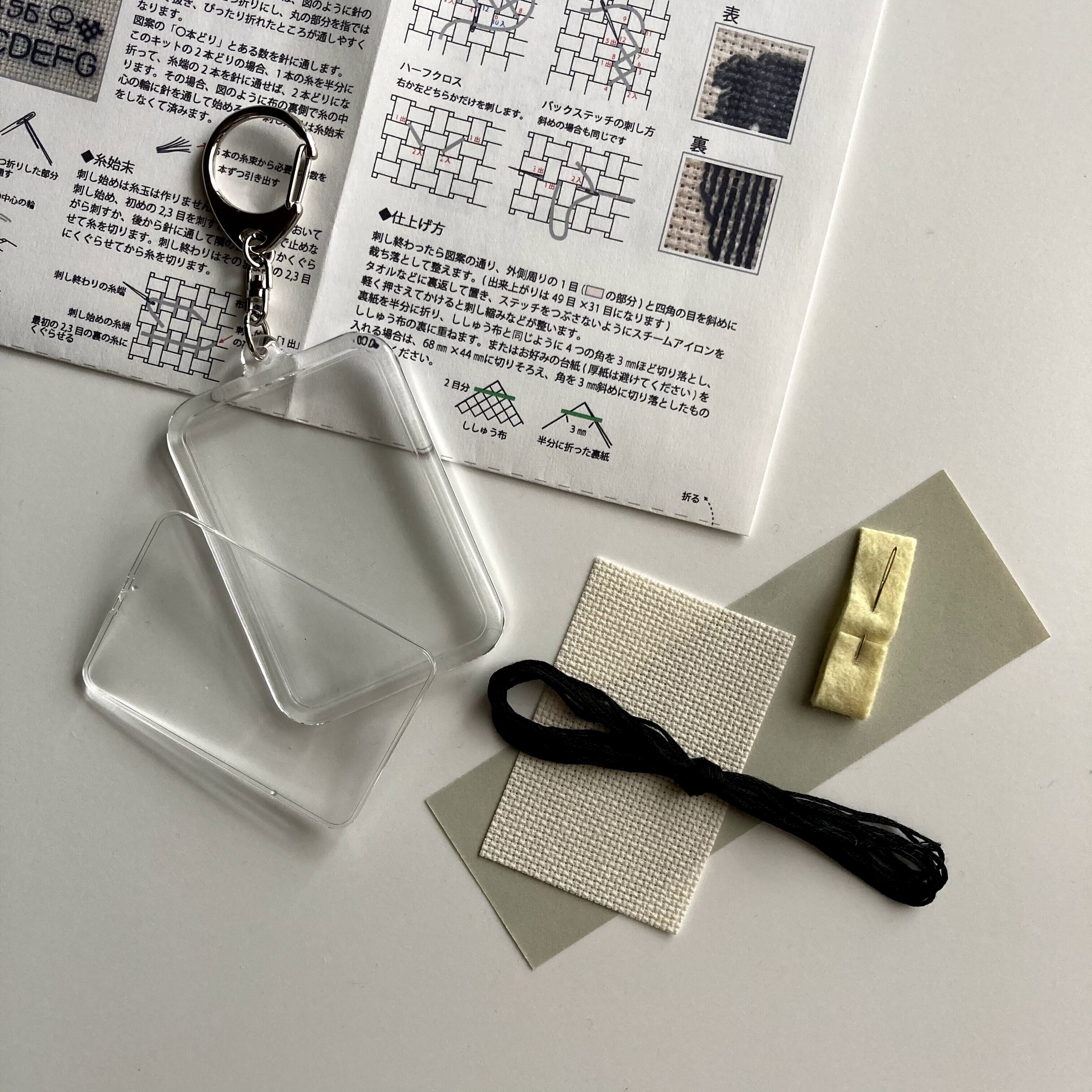 キーホルダー本体と、ししゅう布、ししゅう糸、クロスステッチ針、裏紙と図案、刺し方説明がセットになっています。