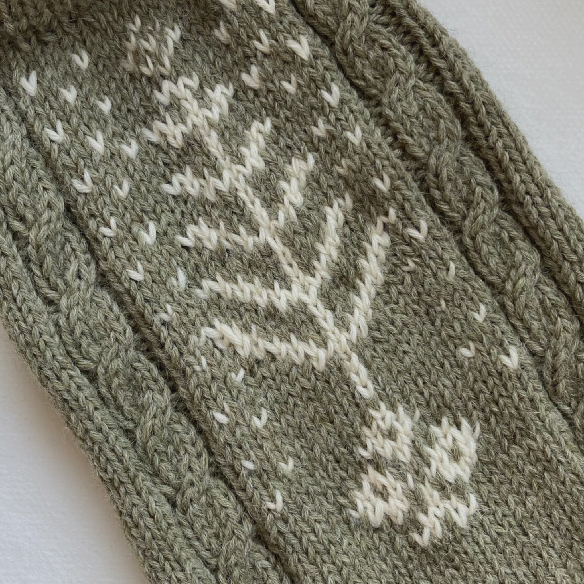 メランジのニュアンスのあるオリーブをベースに、生成りでもみの木柄を編みこんだニットです。伝統柄のもみの木にダイヤ柄と雪を思わせる編込みをアレンジして、背中側一面を飾ってみました。7号の棒針で編んだ編地は薄すぎず地厚すぎずで程よい柔らかさです。