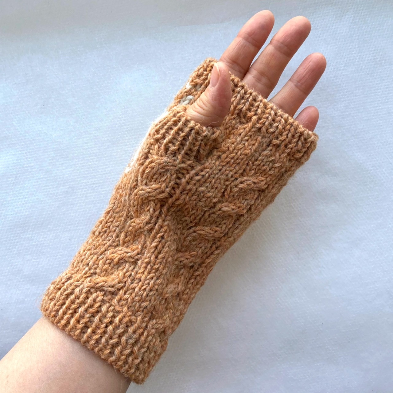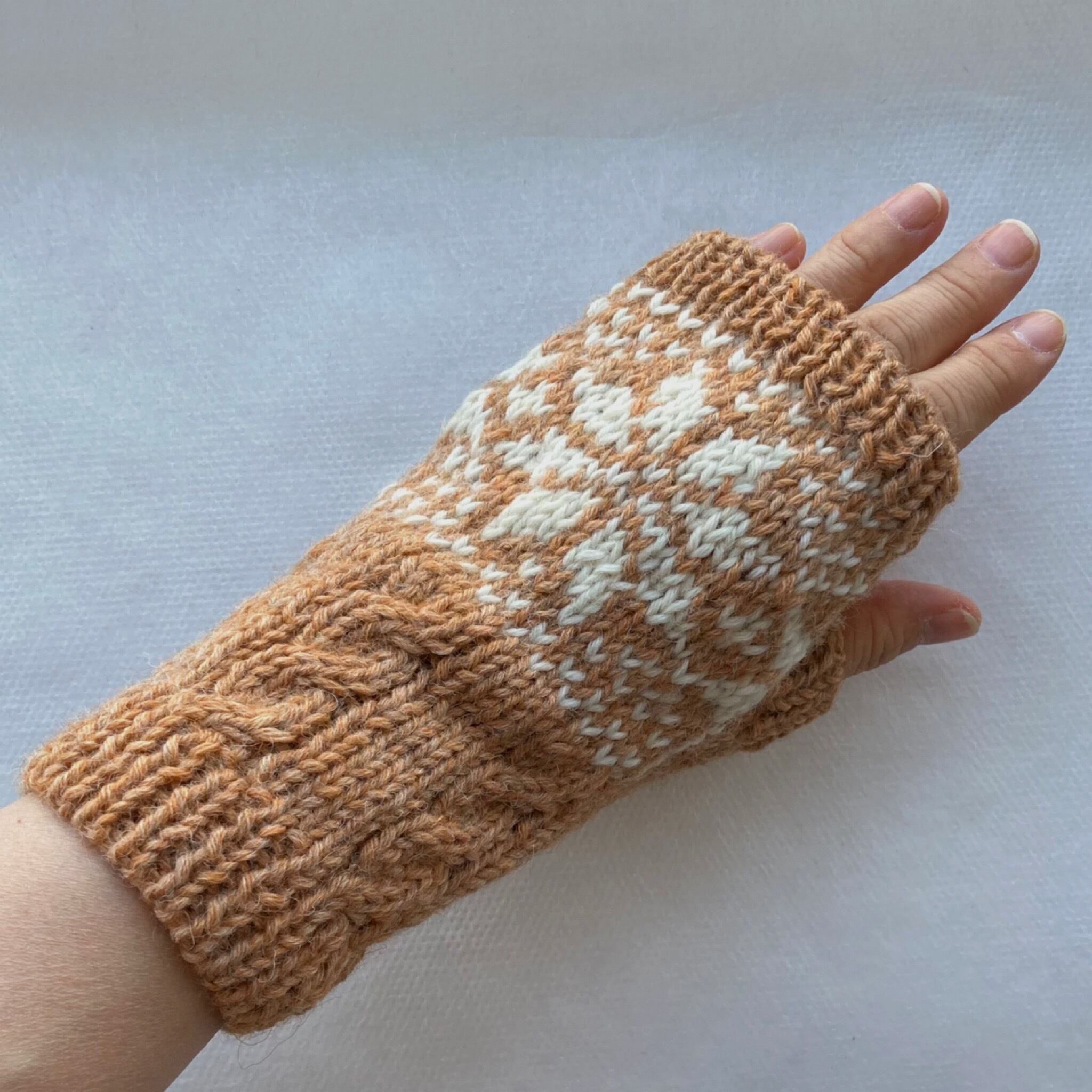 雪柄の編込みとケーブルのハンドウォーマー れんが