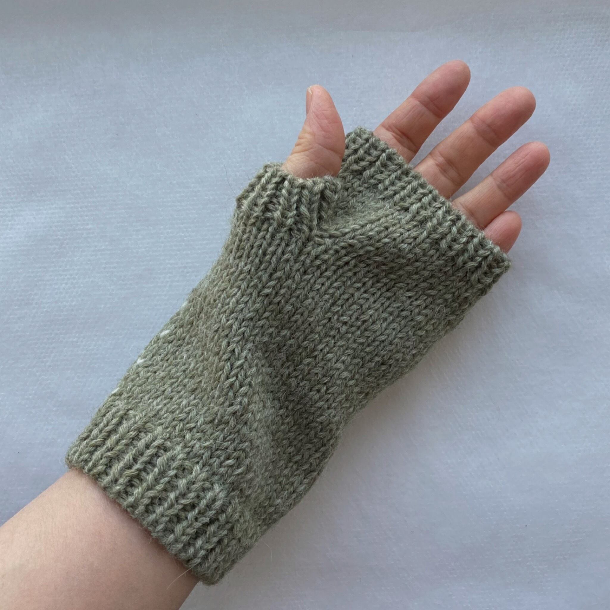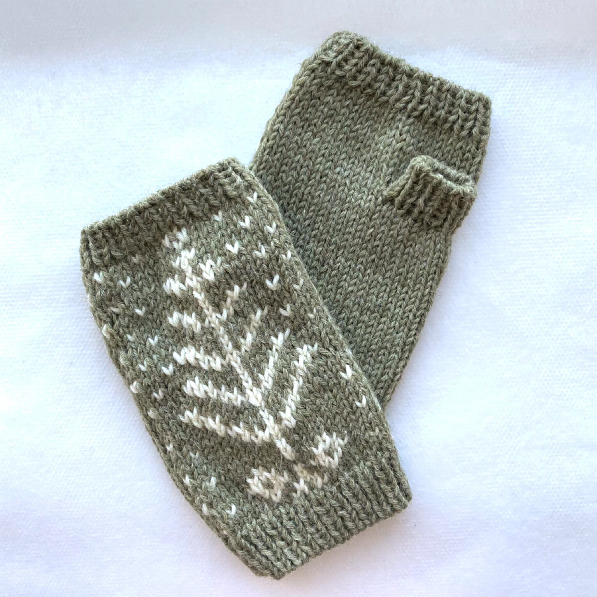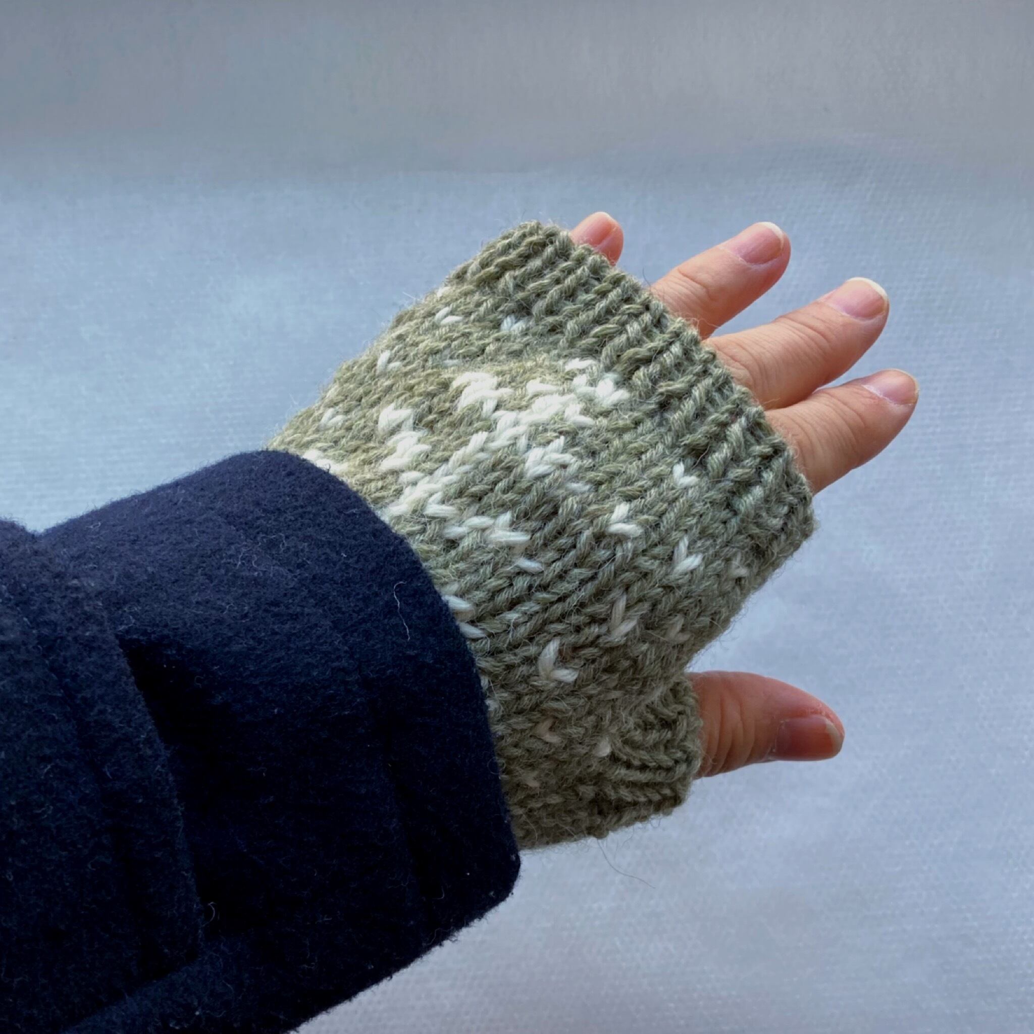メランジのニュアンスのあるオリーブをベースに、生成りでもみの木柄を編みこんだハンドウォーマーです。伝統柄のもみの木にダイヤ柄と雪を思わせる編込みをアレンジして、手の甲側を飾ってみました。