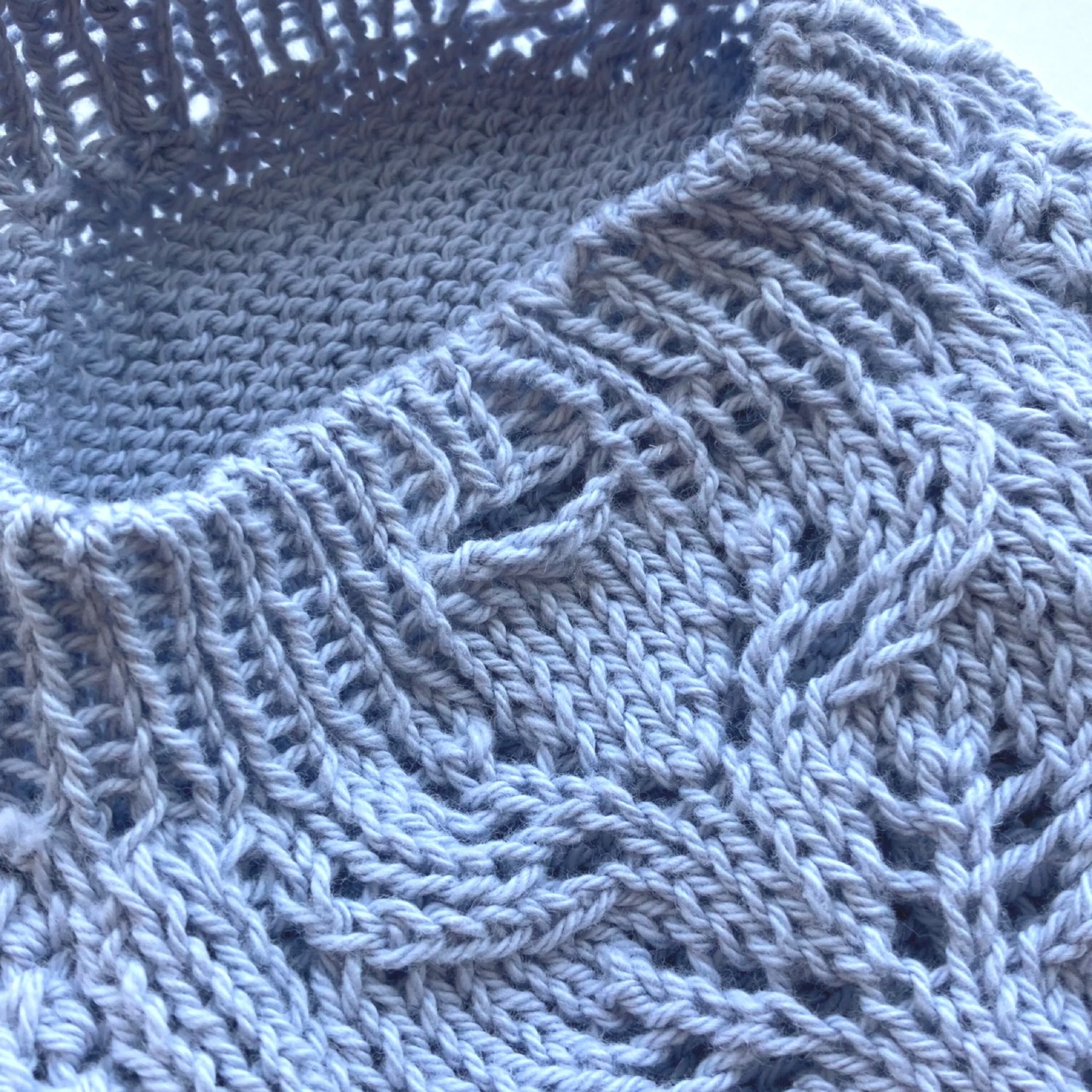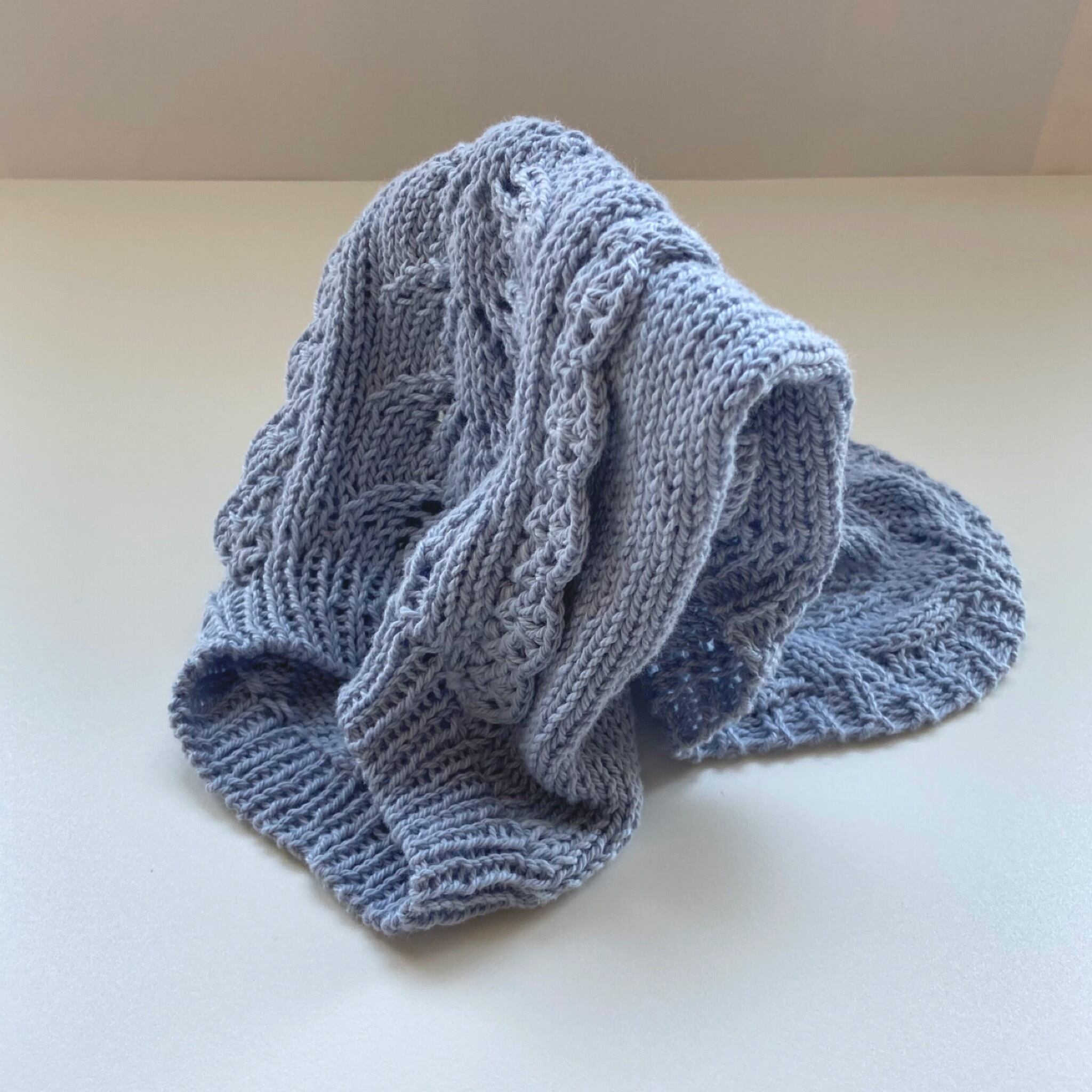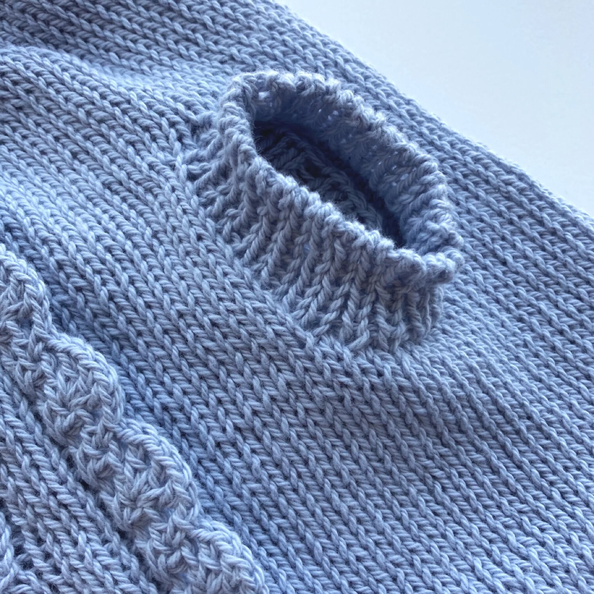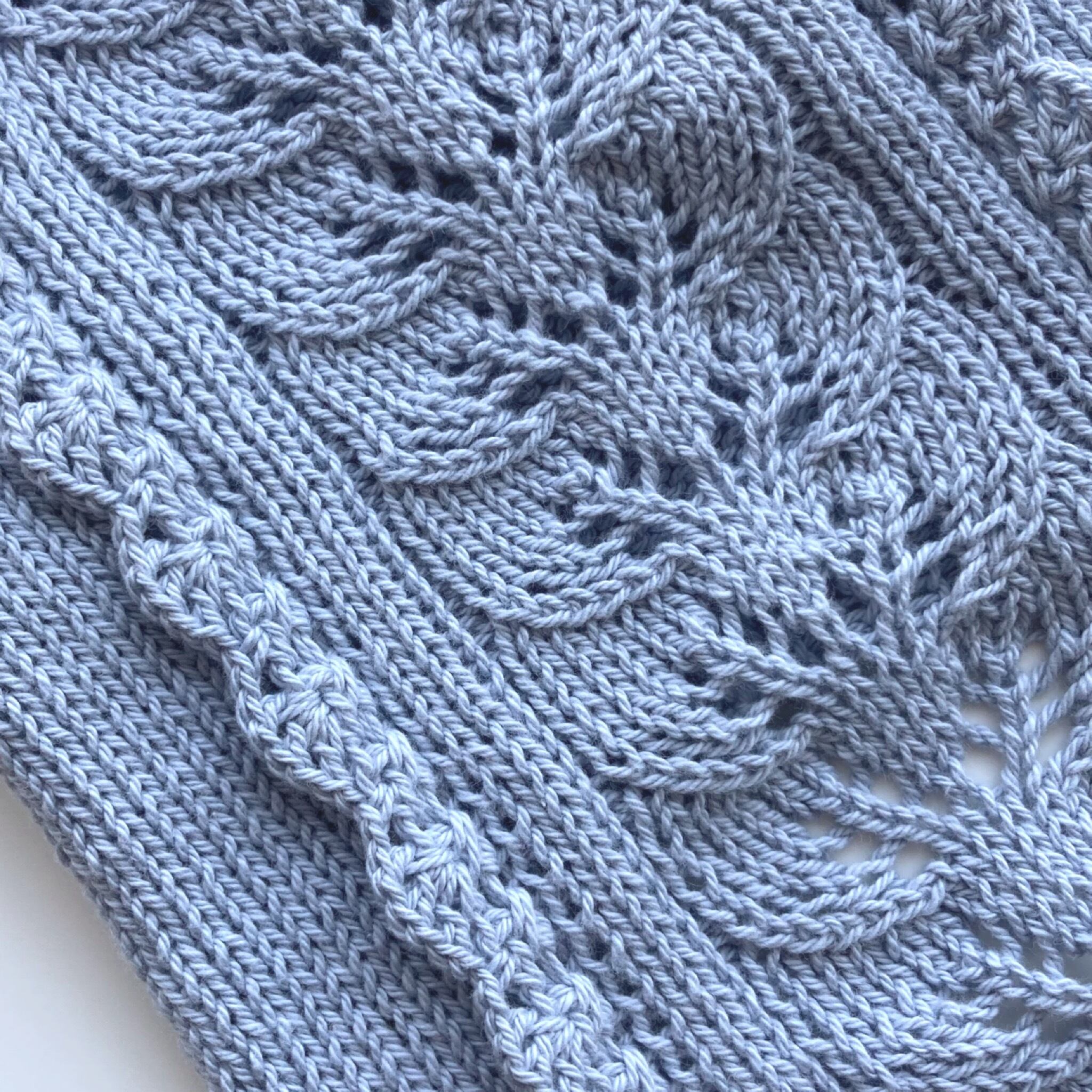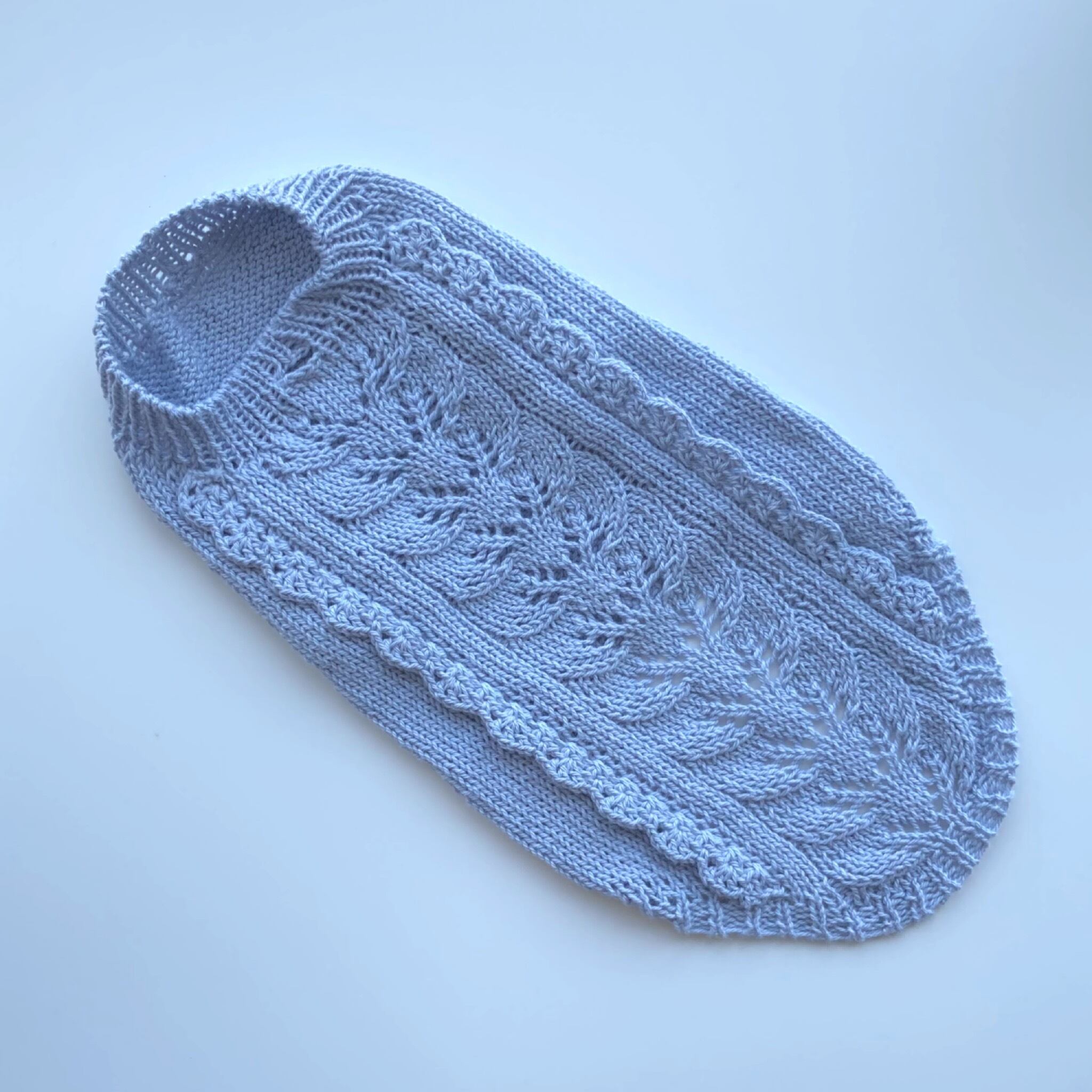 落ち着いたスカイブルーの色に、細糸のサマーニット向きの繊細なリーフ柄を背中側中央に配しています。そして甘すぎずけれど可愛らしさを意識して、両サイドにスカラップのさりげないフリルをあしらいました。