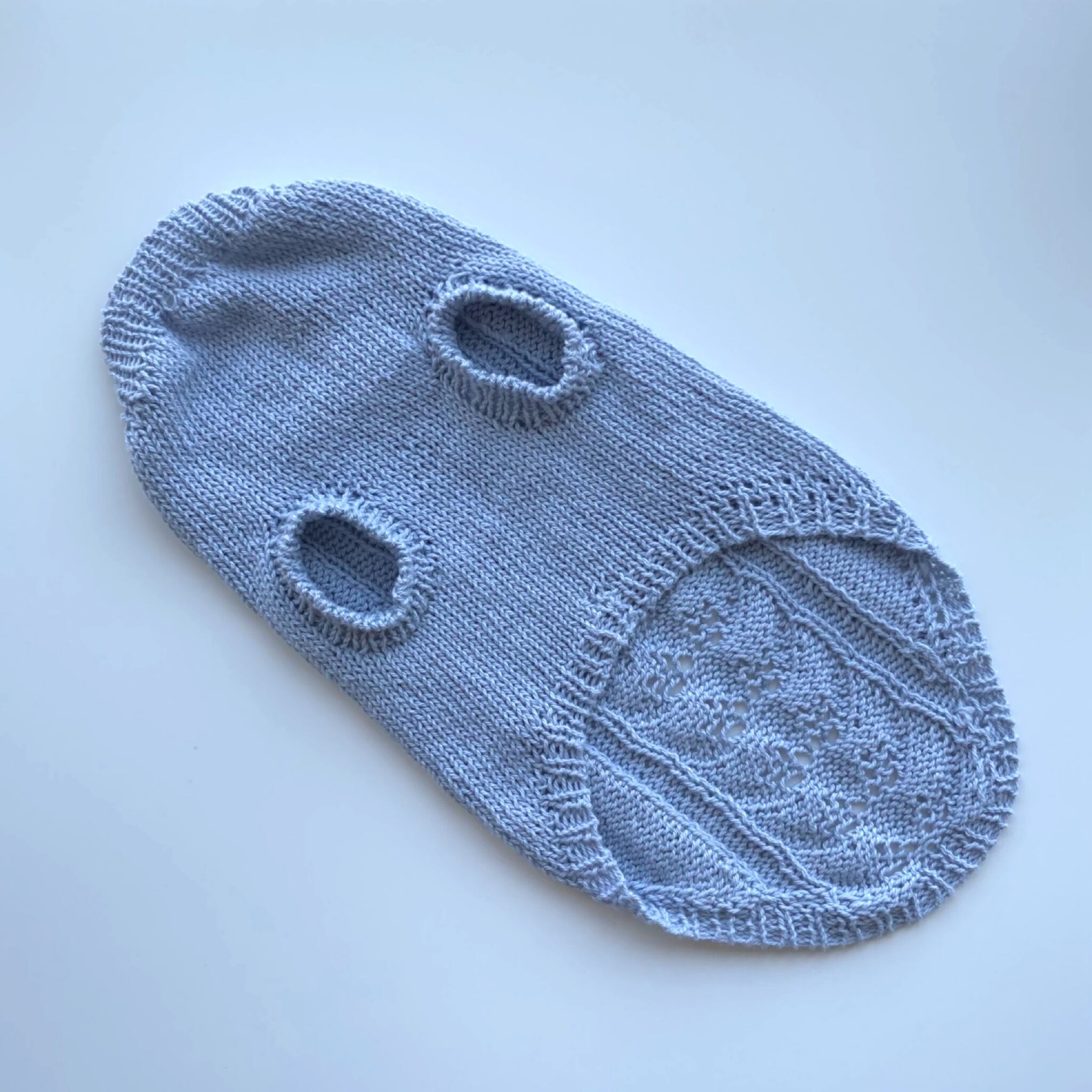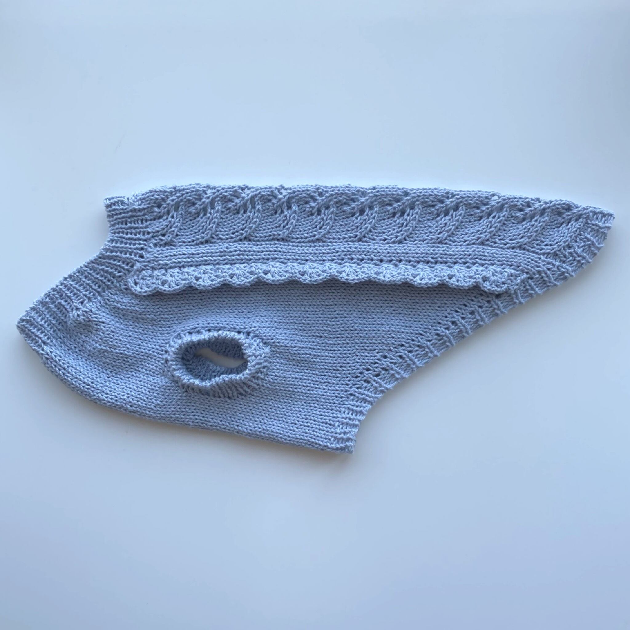 UVカット加工された綿糸を棒針で編み上げたわんこさん用のサマーニットです。とても柔らかな綿100%の細糸は薄手で軽く、心地良いとろんとした柔らかい肌触りです。