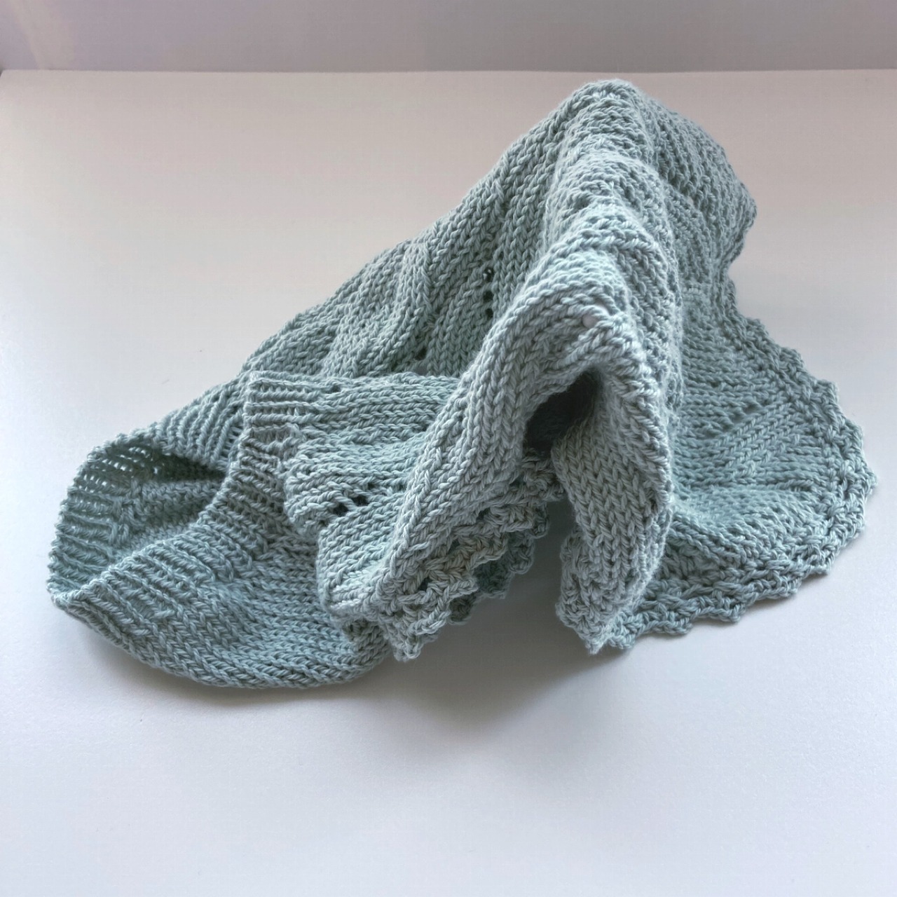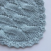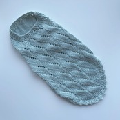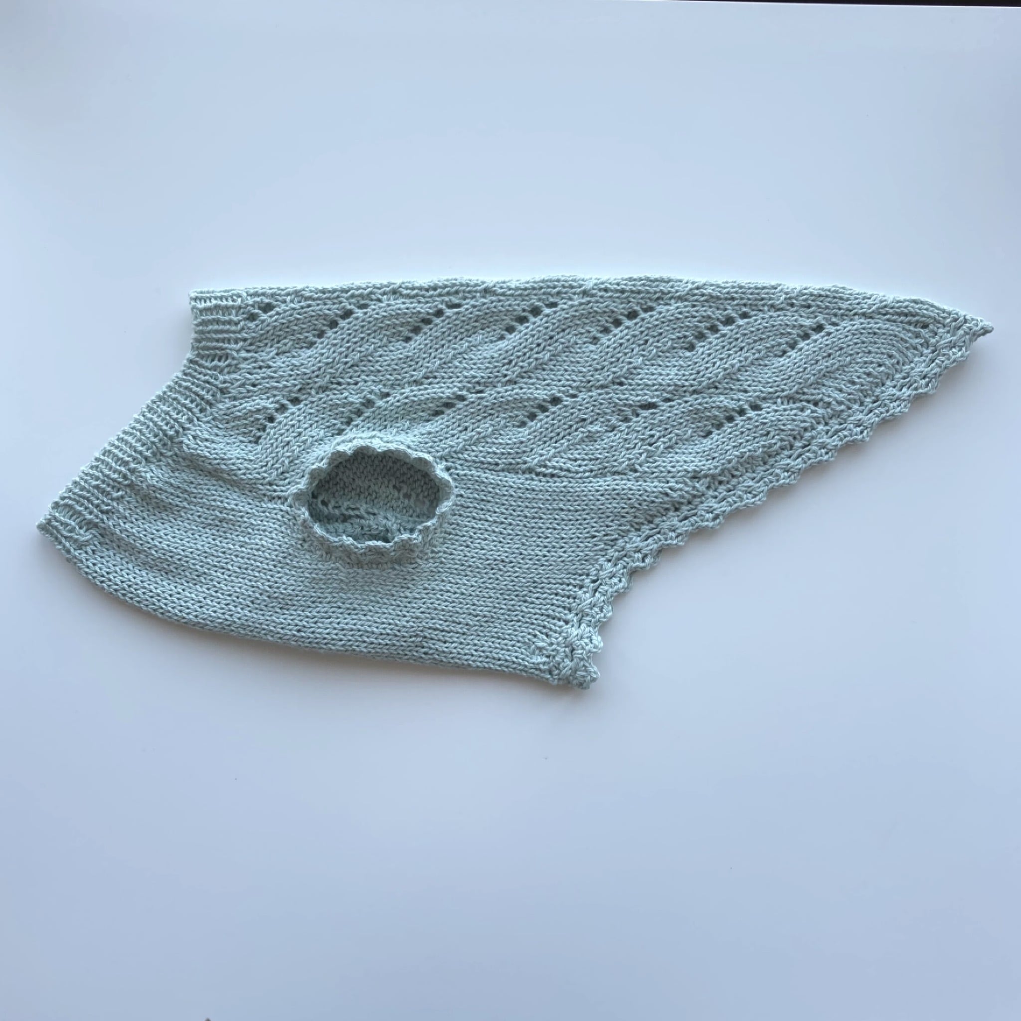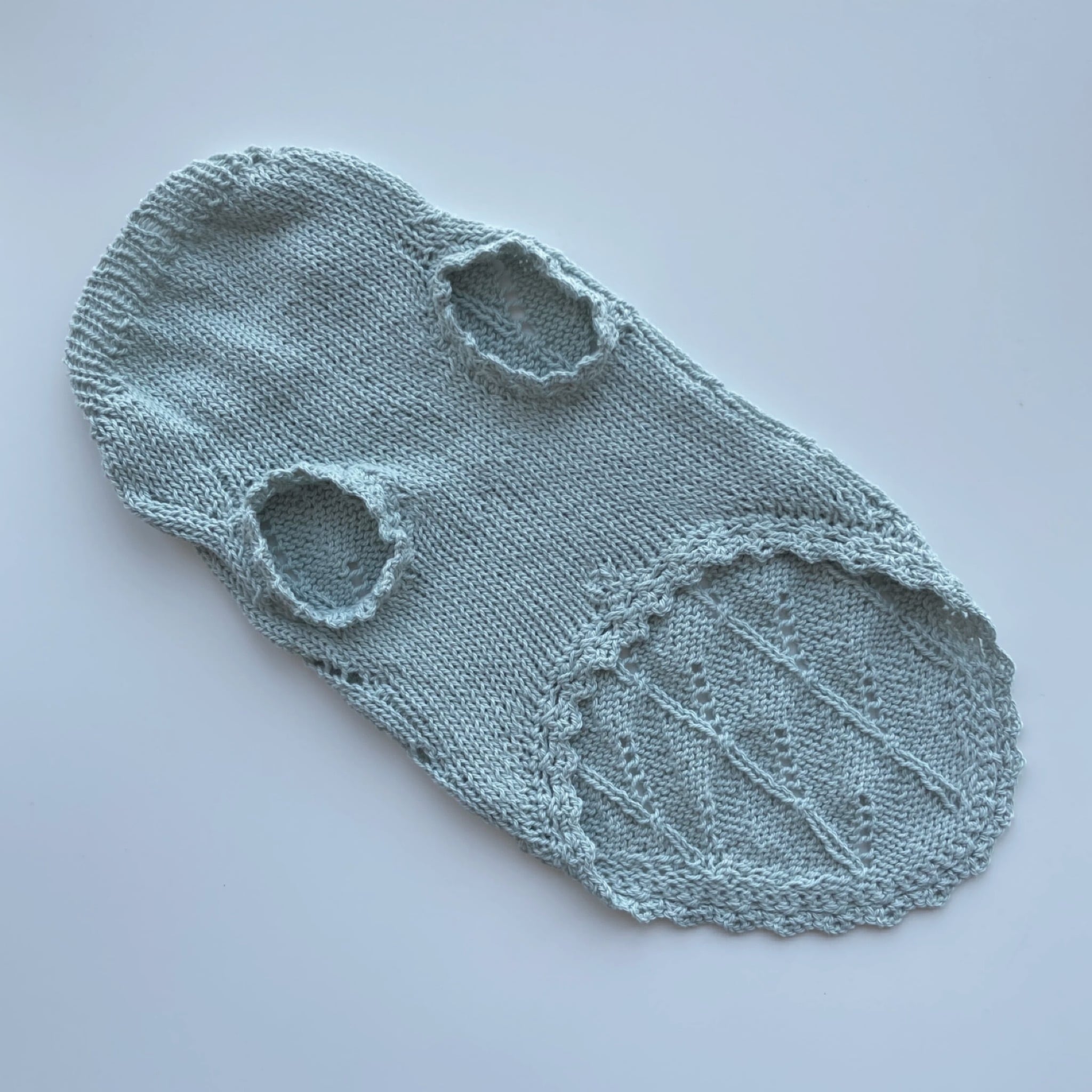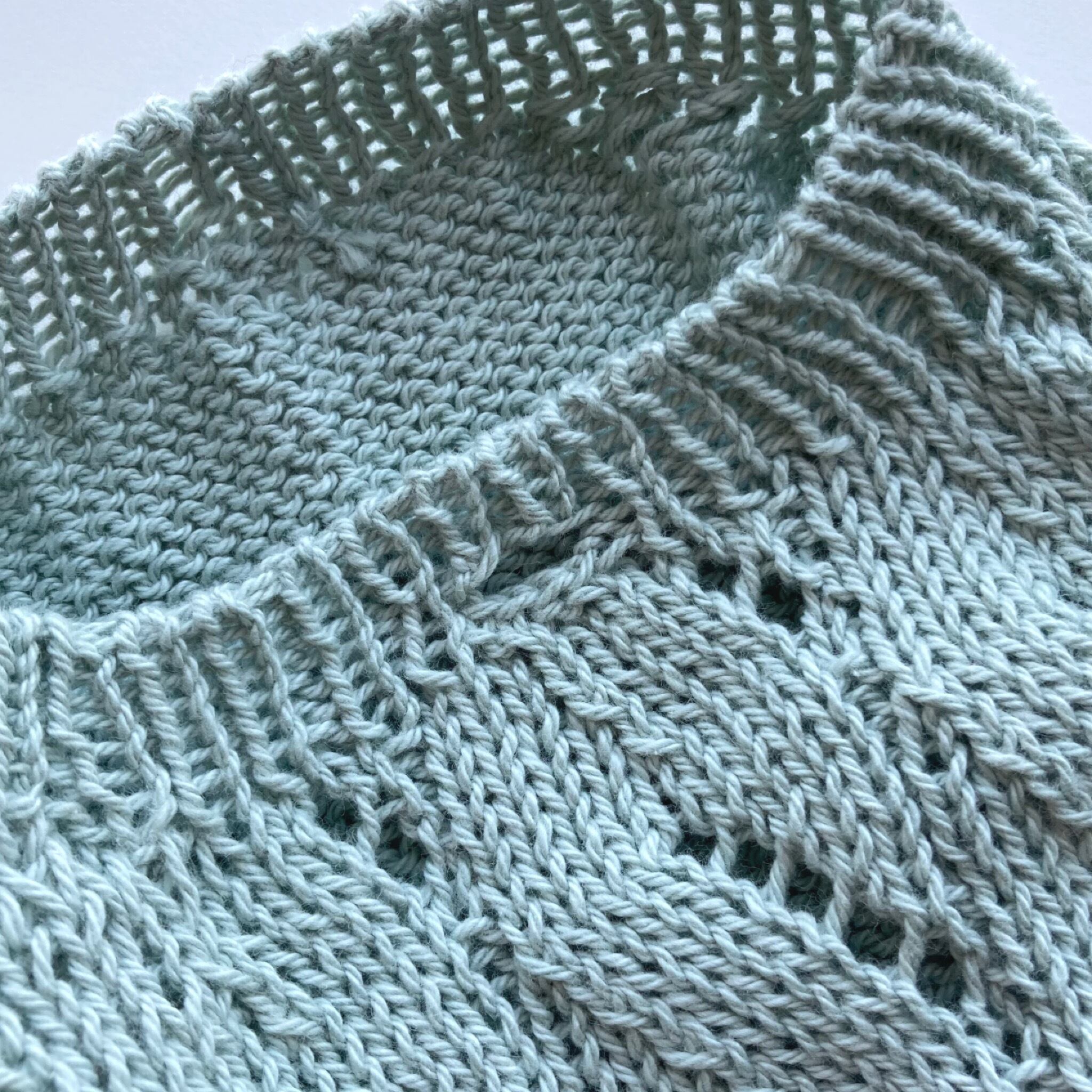 落ち着いたグレイッシュグリーンに、ケーブル模様にも見える穴あきの連続柄を全面に配したサマーニット。ウェーブのように繰り返す穴柄が涼しげな印象です。繰り返しのパターン柄のアクセントに裾と足ぐりにはかぎ針編のふち編を飾りました。
